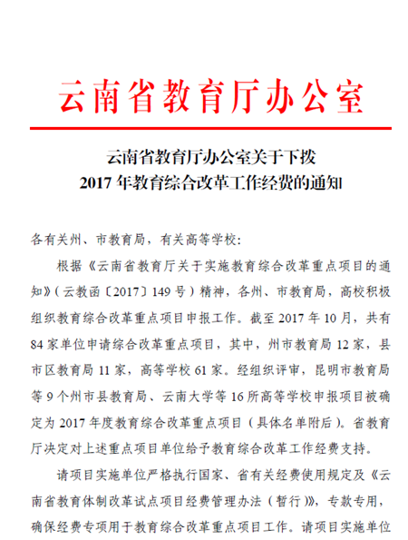 根据《云南省教育厅关于实施教育综合改革重点项目的通知》(云教函﹝2017﹞149号)精神,我校积极组织教育综合改革重点项目申报工作,此次共有84家单位申请综合改革重点项目,其中,州市教育局12家,县市区教育局11家,高等学校61家。经组织评审,昆明市教育局等9个州市县教育局、云南大学等16所高等学校申报项目被确定为2017年度教育厅综合改革重点项目。省教育厅决定对上述重点项目单位给予教育综合改革工作经费支持。