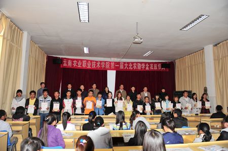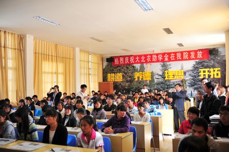 会议在大北农集团与畜牧兽医系领导向“大北农班”的20名学生发放助学金达到高潮,全场师生向受助学生报以热烈的掌声!