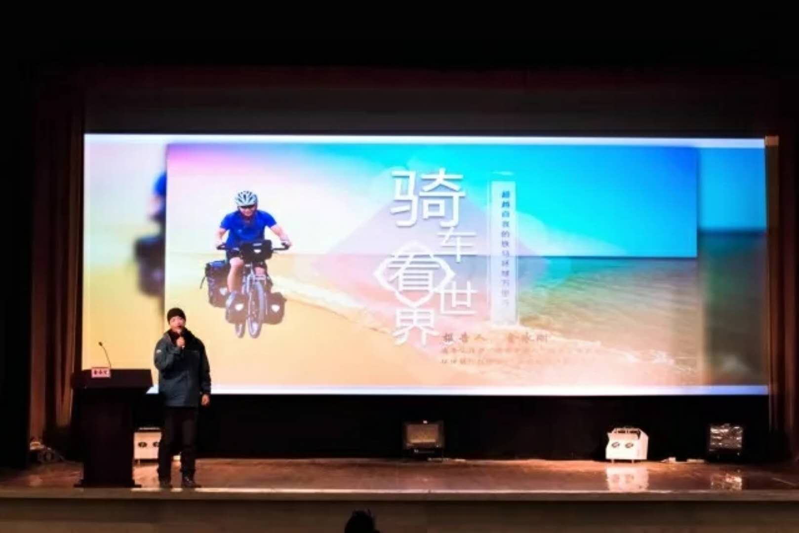 之邀,到校和同学们一起分享过他的精彩故事,当时他已经完成新疆、西藏等地和东南亚地区的骑行,挑战过各种严酷的气候和自然条件,正在为环球骑行的梦想积累经验。今年8月底,金永刚先生历时2年4个月,途经6大洲27个国家43650公里的环球骑行活动圆满结束,他也因此成为我省第一位完成这一壮举的骑行家。他在环球骑行中致力于环保和公益活动,沿途传播了中国精神和中国故事,用车轮丈量出生命的厚度。同时在这十年间,他在北京大学、上海复旦大学等著名院校和省内60余所高校进行了多场励志和公益演讲。报告会上金永刚先生用上百幅旅途中的照片和生动的语言,为青年学子展示了一个广阔的世界,打开了一扇了解世界的窗口,以环游世界的亲历亲闻见证了祖国的日愈强大,诠释了在这样一个催人奋进的时代,一个普通的年轻人用勇气和毅力追求青春无悔的圆梦故事。