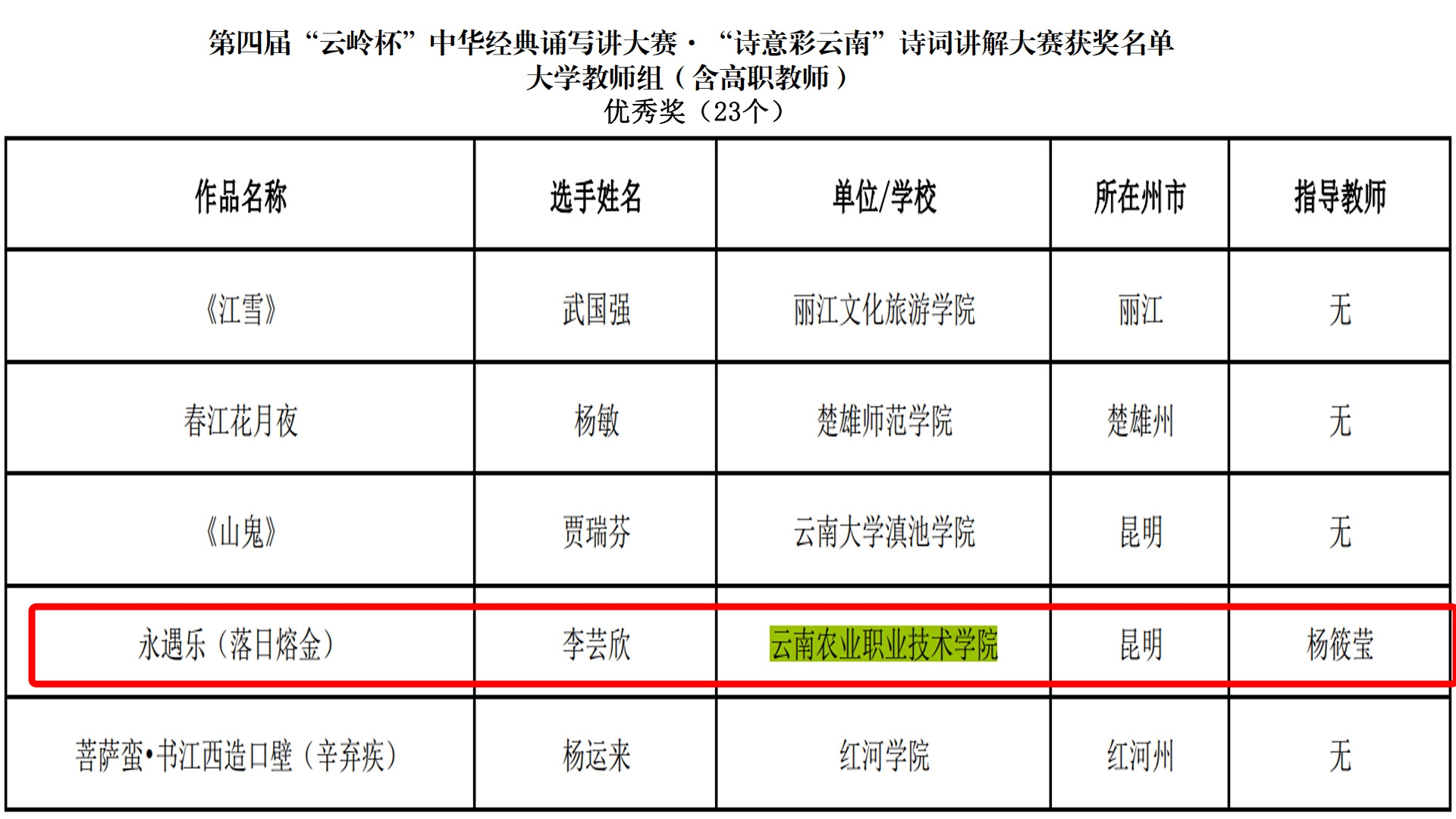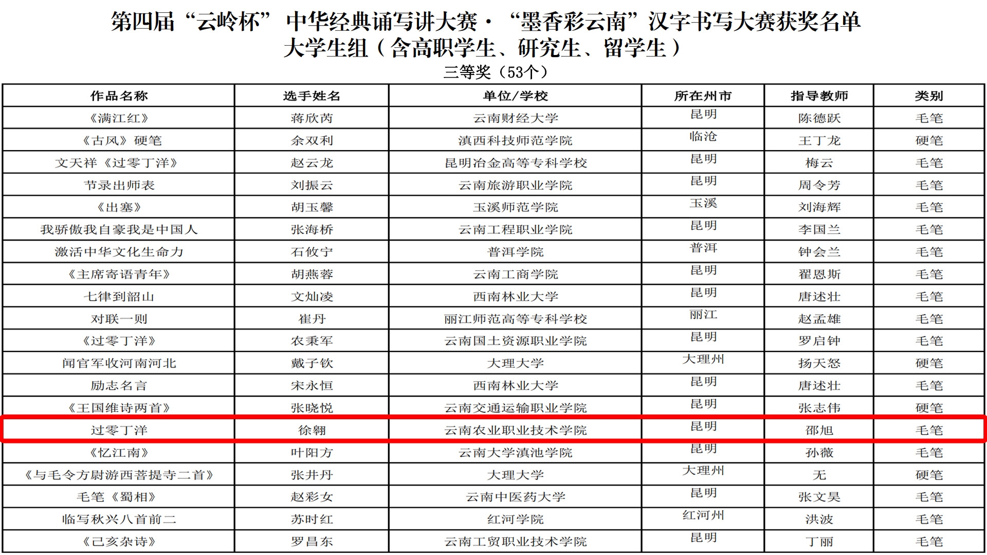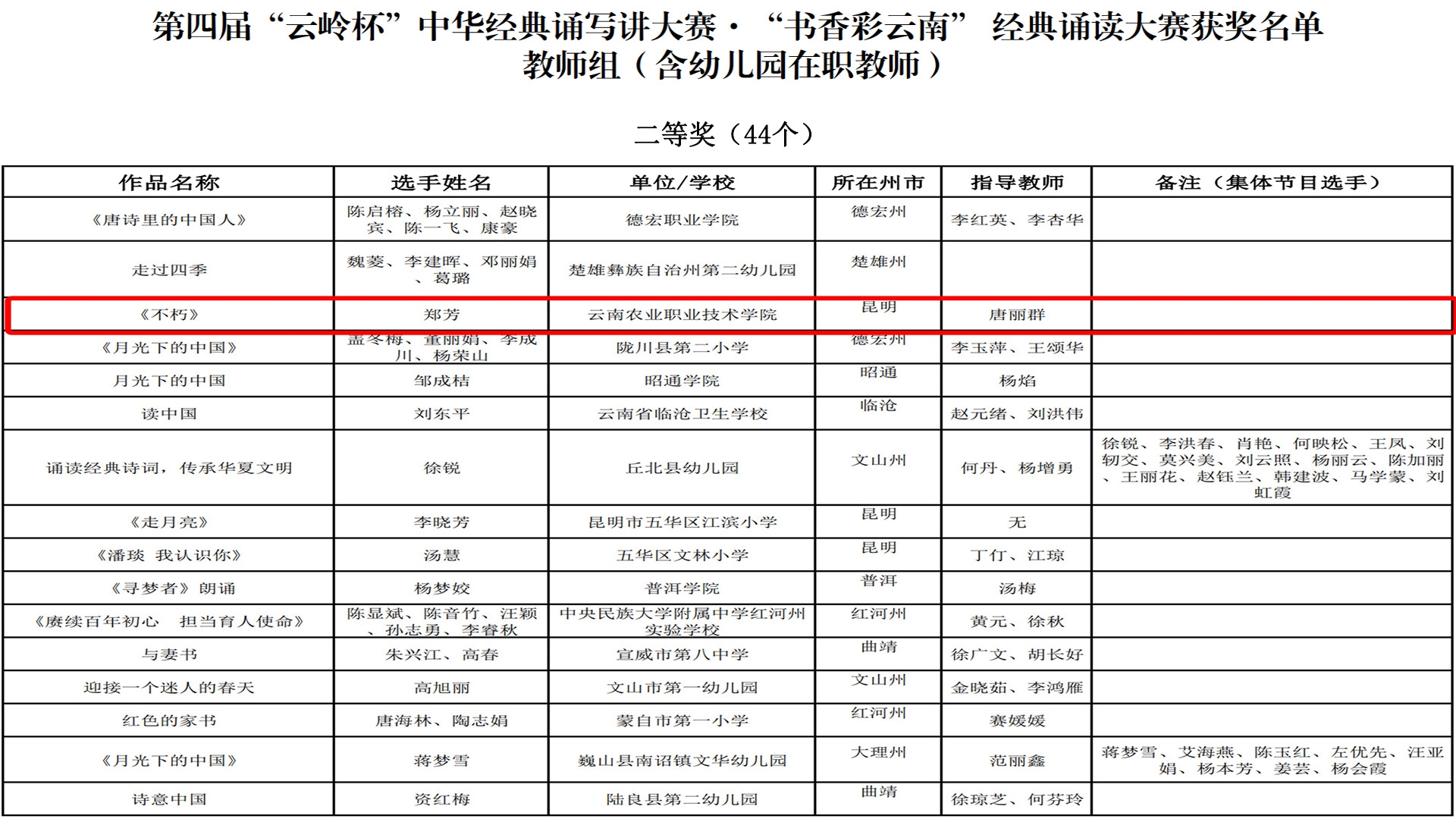 通知中心近日,省教育厅、省语委举办的第四届“云岭杯”中华经典诵写讲大赛系列活动公布了获奖名单,我院师生在多个项目中获奖。郑芳老师的作品《不朽》获经典诵读大赛教师组二等奖;杨华昌老师的作品《子衿》获诗词讲解大赛教师组三等奖;李芸欣老师的作品永遇乐(落日熔金)获诗词讲解大赛教师组优秀奖。顾李通同学的作品《有的人》获经典诵读大赛大学生组二等奖;徐翱同学的作品《过零丁洋》获汉字书写大赛大学生组三等奖;施晓鹏同学的作品《我的祖国》、莫慧萍同学的作品《社会主义核心价值观》、刘莉同学的作品《七律长征》获汉字书写大赛大学生组优秀奖。