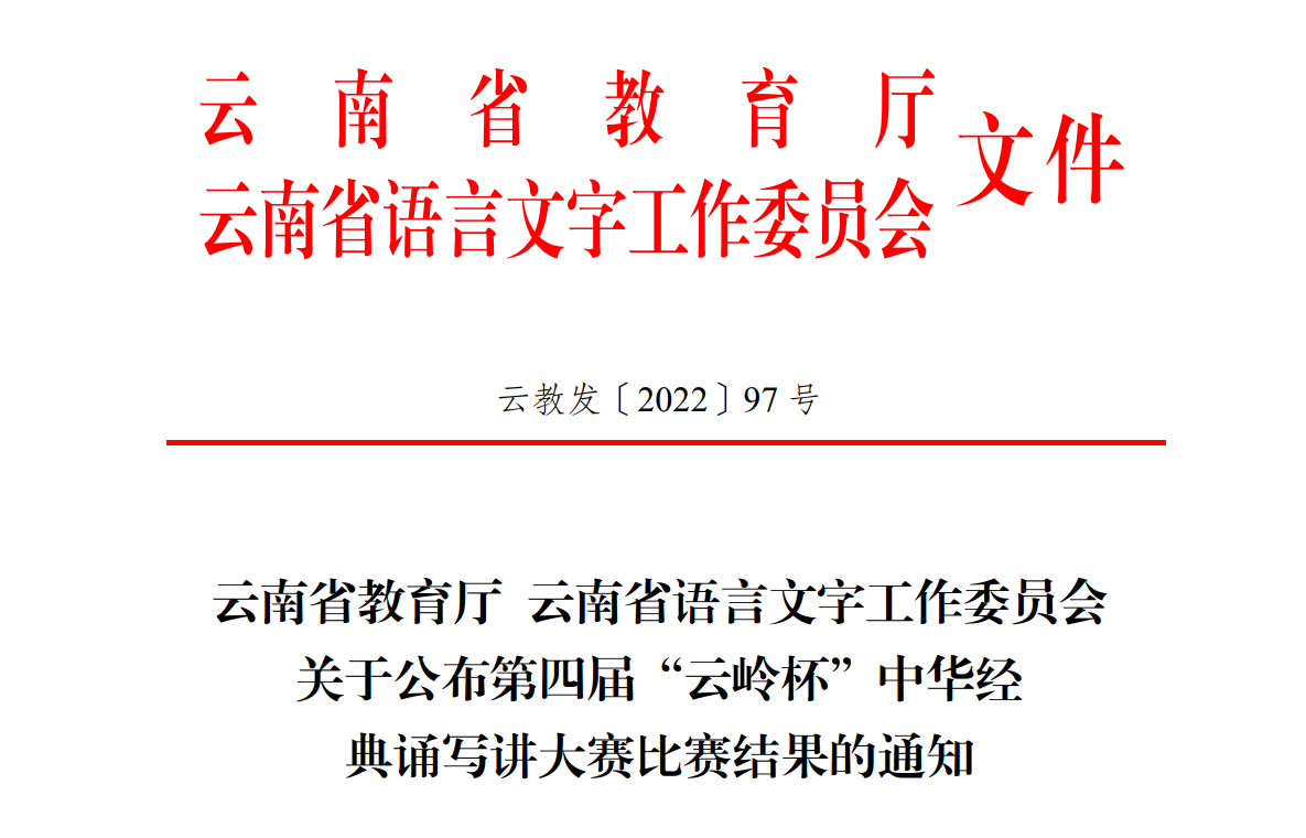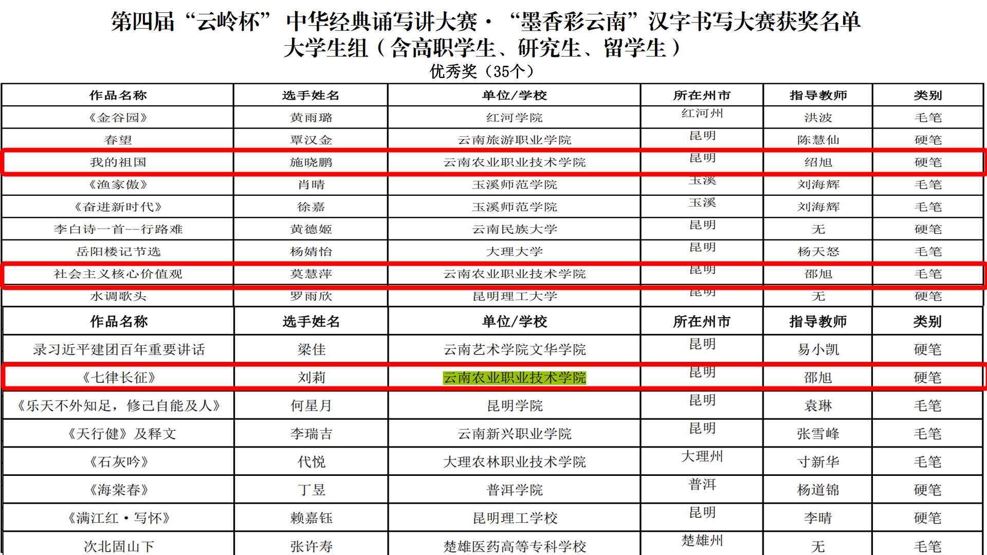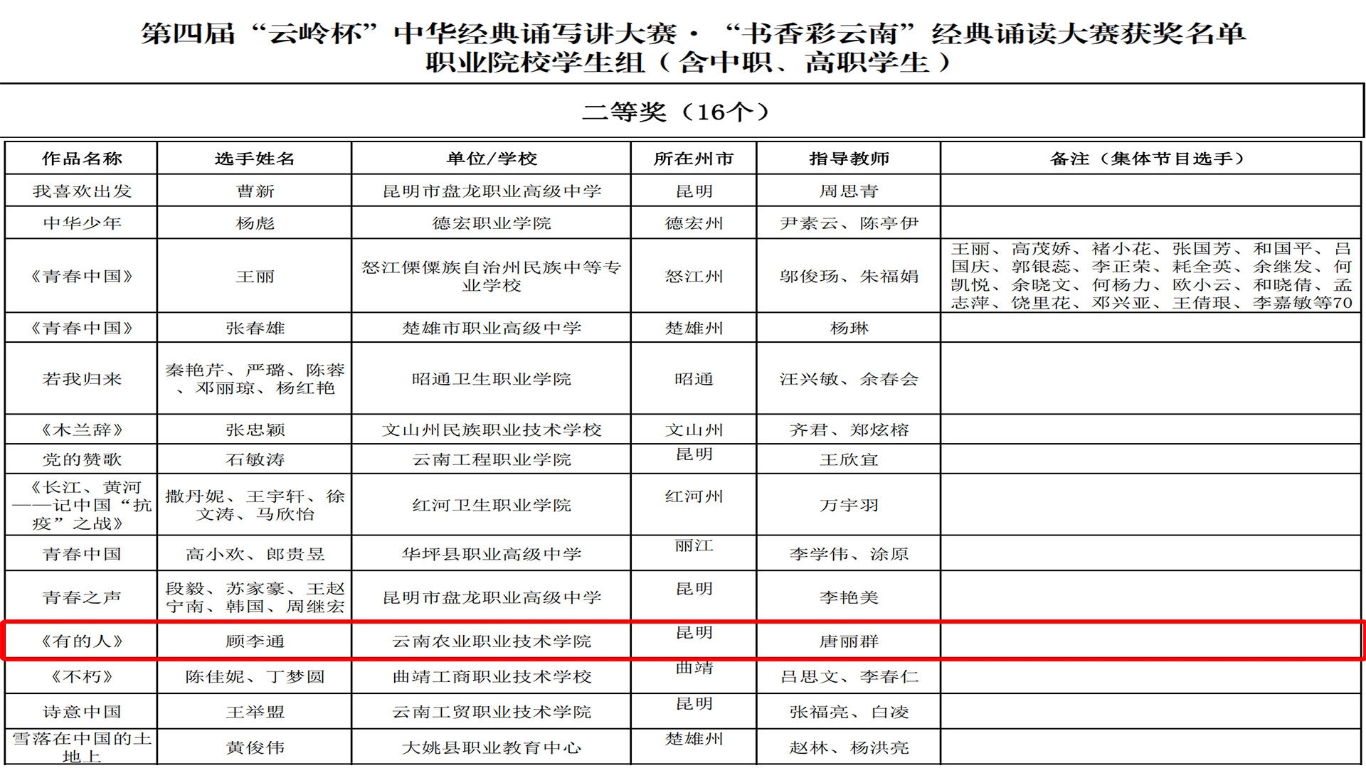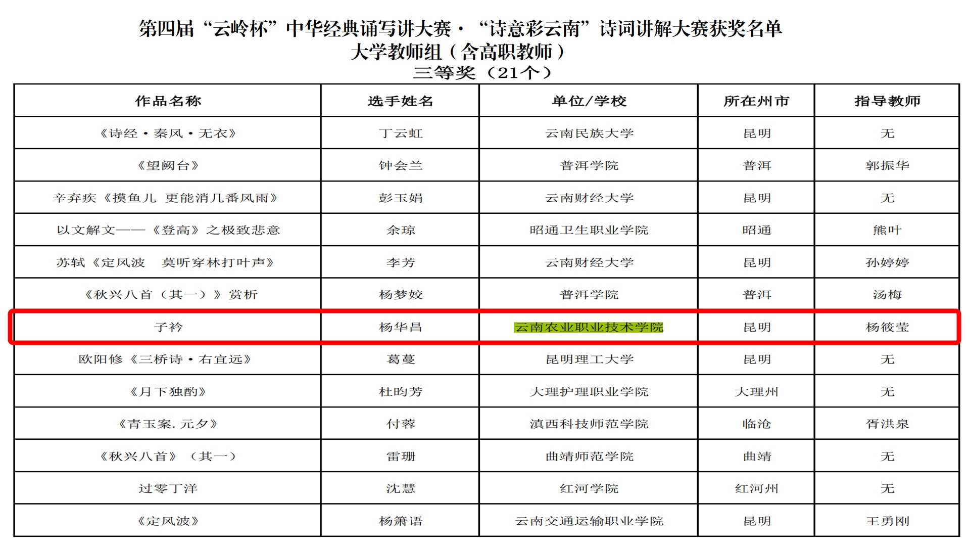 通知中心近日,省教育厅、省语委举办的第四届“云岭杯”中华经典诵写讲大赛系列活动公布了获奖名单,我院师生在多个项目中获奖。郑芳老师的作品《不朽》获经典诵读大赛教师组二等奖;杨华昌老师的作品《子衿》获诗词讲解大赛教师组三等奖;李芸欣老师的作品永遇乐(落日熔金)获诗词讲解大赛教师组优秀奖。顾李通同学的作品《有的人》获经典诵读大赛大学生组二等奖;徐翱同学的作品《过零丁洋》获汉字书写大赛大学生组三等奖;施晓鹏同学的作品《我的祖国》、莫慧萍同学的作品《社会主义核心价值观》、刘莉同学的作品《七律长征》获汉字书写大赛大学生组优秀奖。