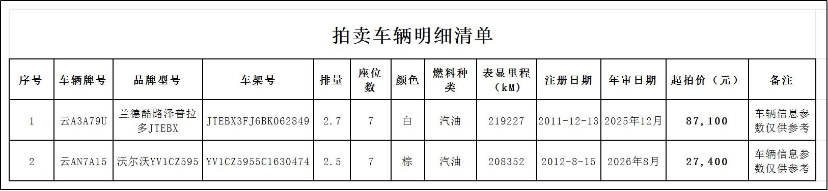 三、标的展示时间、地点:2025年10月23日起至2025年10月24日止(每天9:00—17:00,请提前24小时与拍卖公司预约看样时间),展示地址:云南省昆明市五华区茭菱路128号地下停车场。