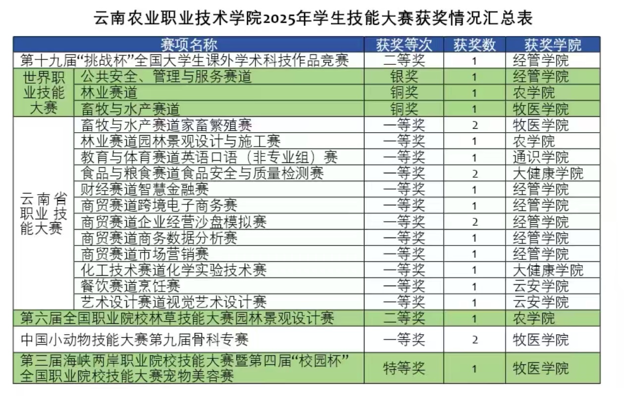 通知中心时至金秋,2025年世界职业院校技能大赛和云南省职业院校技能大赛等比赛相继落幕,我校参赛团队凭借扎实的专业知识、精湛的操作技艺以及默契的团队协作,一路披荆斩棘,斩获多项大奖,充分展示了云农院学子“以技立身、以技赋能”的青春风采,为学校“十四五”的收官工作交上了一份完美答卷。