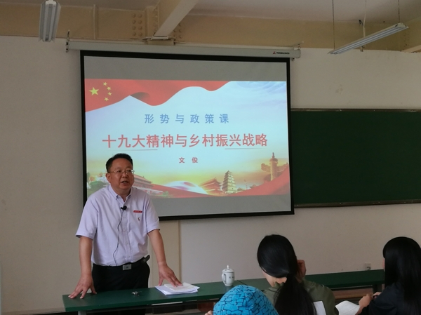 通知中心2018年7月3日下午,文俊院长走进课堂,走上讲台,为学生上了一堂生动的以“党的十九大精神和乡村振兴战略”为主题的形势与政策课。