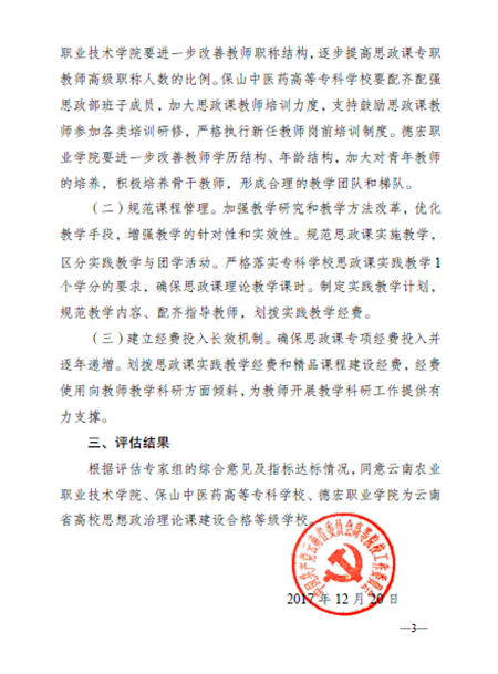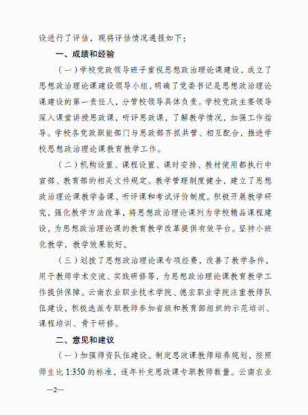 通知中心2017年12月20日,省委高校工委根据评估专家组的综合意见及我校思政课建设指标达标情况,同意我校为“云南省高校思想政治理论课建设合格等级学校”。