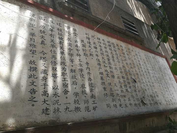 首先,大家参观了位于昆明市华山东路的大德寺双塔,1930年至1937年云南省立第一农业学校在双塔寺办学,为学校办学旧址。大德寺始建于1469年,曾经是昆明较大的佛寺之一,过去的大德寺与华山寺相对,清人朱筱园有《双塔寺》诗云:“古寺嵌螺峰,出奇五华外。干霄两浮图,俯受乱山拜。城市几劫灰,矗立终不坏。”大德寺双塔始建于明成化三十年,现在,深藏在高高水泥建筑群中的双塔寺,双塔如故,寺已无存。昔日壮美的双塔,如今掩藏在高大的水泥建筑物中,显得些许苍凉,双塔与它身边的古柏静静伫立,见证历史沧桑,岁月风雨。