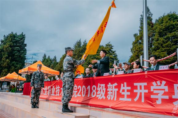最后,党委书记崔金赋向军训团授旗。副院长田应华宣布2018级新生军训正式开始。