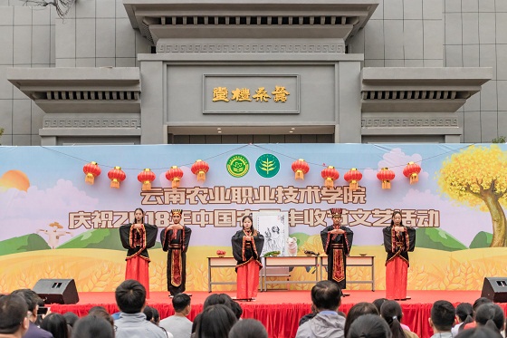 9月20日上午10:30,我院在新落成的农耕文化广场举行了庆祝2018年中国农民丰收节文艺活动,党委书记崔金赋,院长文俊,副院长赵鸿阳、杨波、田应华,纪委书记冯志宏出席本次活动,广大师生员工约200余人参加庆祝活动。首先,由崔书记致辞。他向广大师生员工指出,我们欢聚一起庆祝首届中国农民丰收节,寄托对“三农”的深厚感情,表达永远不忘以农为主的本色。同时,崔书记强调蚕桑礼堂揭牌和农耕文化广场启用是我院庆祝中国农民丰收节的重要献礼。蚕桑礼堂的揭牌时刻提醒我们要秉承江南网页版登录入口官网网址查询 前身——云南蚕桑学堂的开创精神,秉承团结包容开放的丝路精神,融入江南网页版登录入口官网网址查询 发展过程,融入个人成长进步;农耕文化广场的启用是我院传承百年历史、培养优秀人才、建设一流院校、发展现代农业的重要载体,通过开发利用好丰富多彩的农耕文化资源,春风化雨,润物无声,从农业起步,靠农业发展,为农业奉献,实现自身价值。