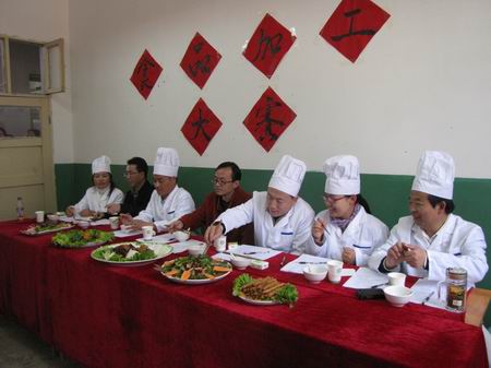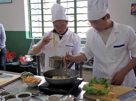 上午,34组选手分6组依次进入比赛现场,在为他们准备好了原料及加工器具的炉灶前开始比拼!选手们身着统一的白色厨师服,或雕刻花朵,或片鱼切肉;或刀工了得,或小心分割;或大火快炒,或小伙慢炖。一时间,煎炸炖炒、麻辣香甜,各色技艺、各种味道精彩呈现!大理海稍鱼、兰州炒面片、川味啤酒鸭、特色两吃鱼、河口菜包等三十多道美味一一呈现在钱林东书记带队的评审团和赵莉副院长、冯志宏部长、董玉洲主任等特邀嘉宾面前时,有的老师不禁赞叹“比有些专业厨师还做得好吃”,“没想到我们的学生还有这么漂亮的一手”!