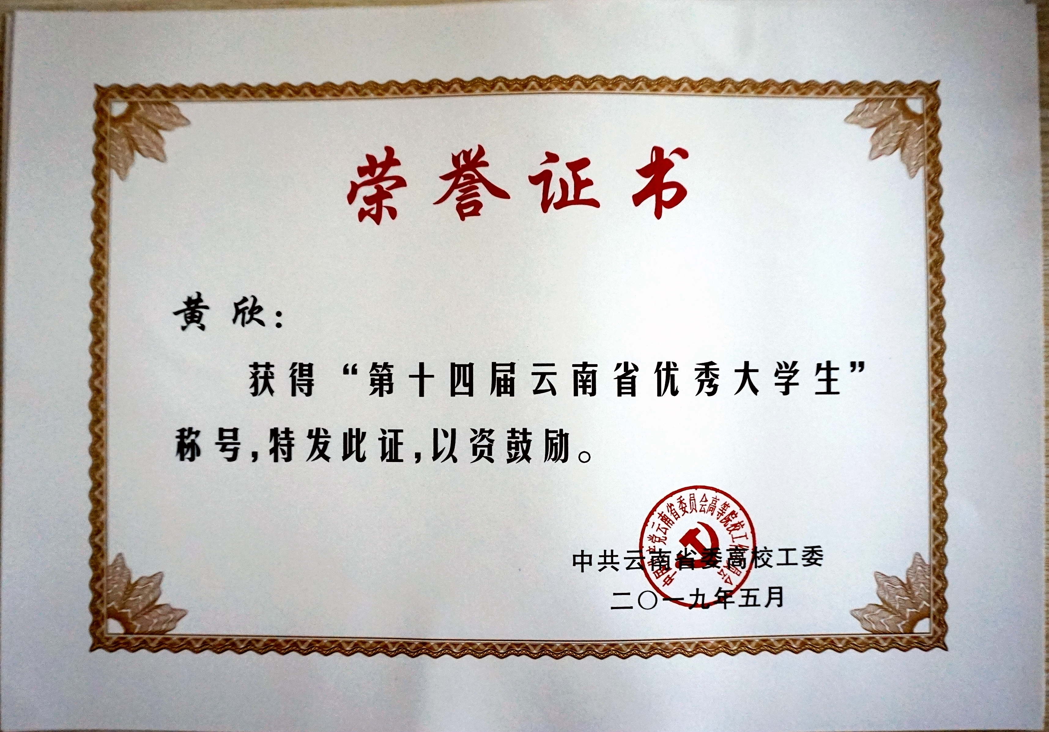 黄欣同学入校以来,严格遵守江南网页版登录入口官网网址查询 的各项规章制度,认真努力,学习刻苦,积极参加各项活动,曾获国家奖学金、国家励志奖学金、 “优秀共青团员”“优秀班干部”等荣誉称号,参加2018年云南省职业技能大赛,获高职组农产品质量安全检测竞赛项目二等奖,免笔试被云南农业大学食品质量与安全专业(专升本)录取。