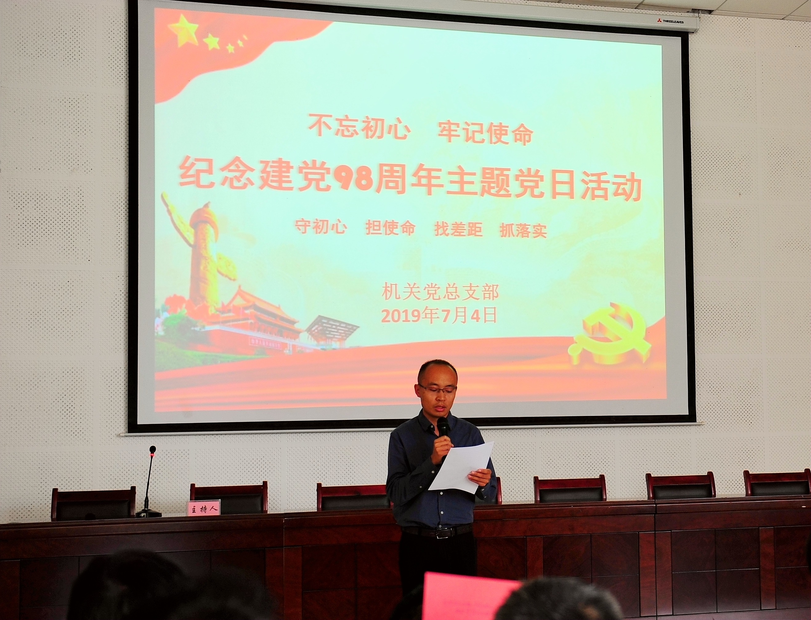 通知中心7月4日下午,机关党总支部在综合楼阶梯教室举行庆祝建党98周年“不忘初心、牢记使命”主题党日活动。机关党总支部下设支部的全体党员、发展对象、入党积极分子约80余人参加,全体党委班子成员均以普通党员的身份参加。活动由机关党总支书记杨筱莹同志主持。