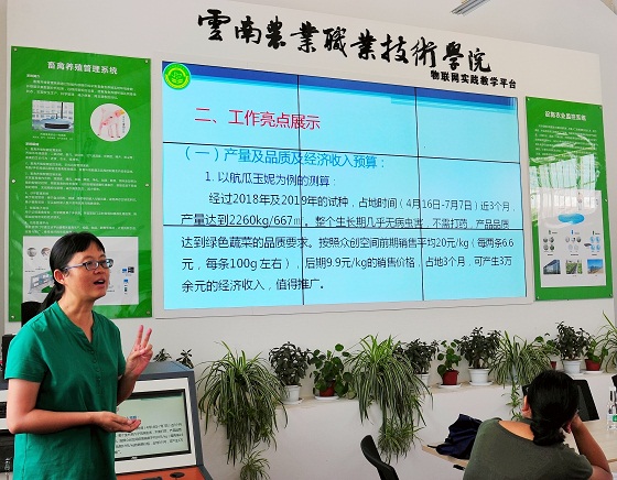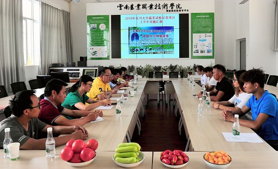 项目负责人刘峻蓉老师介绍了项目实施的基本内容,对2019年上半年校内基地项目情况进行了阶段性的总结汇报,展示了项目取得的亮点与成效——校企共建的太空蔬菜生产性示范实训基被教育部认定为国家校企共建的生产性实训基地;梳理了项目实施过程中存在的问题及解决办法,并就下一季的种植计划进行了初步的安排。东川红园宝玉绿化有限公司董事长王正勇介绍了东川太空蔬菜试验示范项目基地2019年上半年的种植情况,以及今年在带动农户致富扶贫工作中取得的成绩,并对2019年下半年的东川基地示范种植计划向项目组成员做了详细汇报。