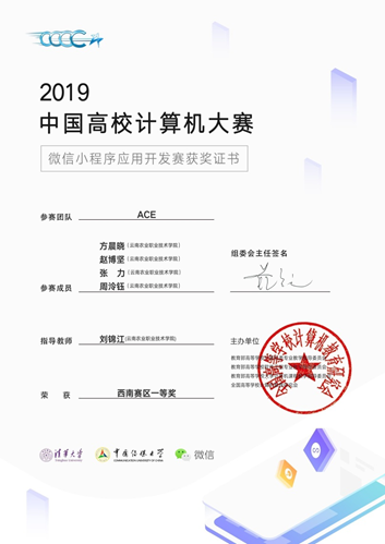 通知中心7月25日,在“2019中国高校计算机大赛——第二届大学生微信小程序应用开发大赛” 西南赛区比赛中,我校派出由互联网技术江南网页版登录入口官网网址查询 方晨晓、周泠钰、张力、赵博坚四位同学组成的代表队虽然首次参赛,但在比赛中坚持不懈,辛苦攻关,不断克服技术难题,认真完成了小程序作品“进场识人”,获得西南赛区一等奖。此次获奖实现了我校在该类国家级竞赛中零的突破,充分展现了我校互联网+专业优质教学水平和学生扎实的专业能力。