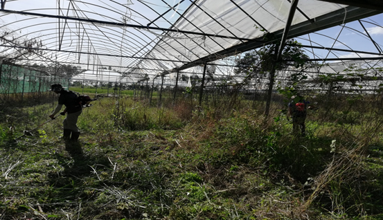 基地草害严重,大棚种植区还淹水严重,基地环境脏烂、藤本杂草蔓延。今年柬埔寨严重干旱,年初种植的热带果树部分干死。但可喜的是原示范园已栽芒果树通过去年年底的修剪、除杂木、清藤蔓杂草、防棉蚜虫、防蚧壳虫和施肥管理等措施,长势较好。
