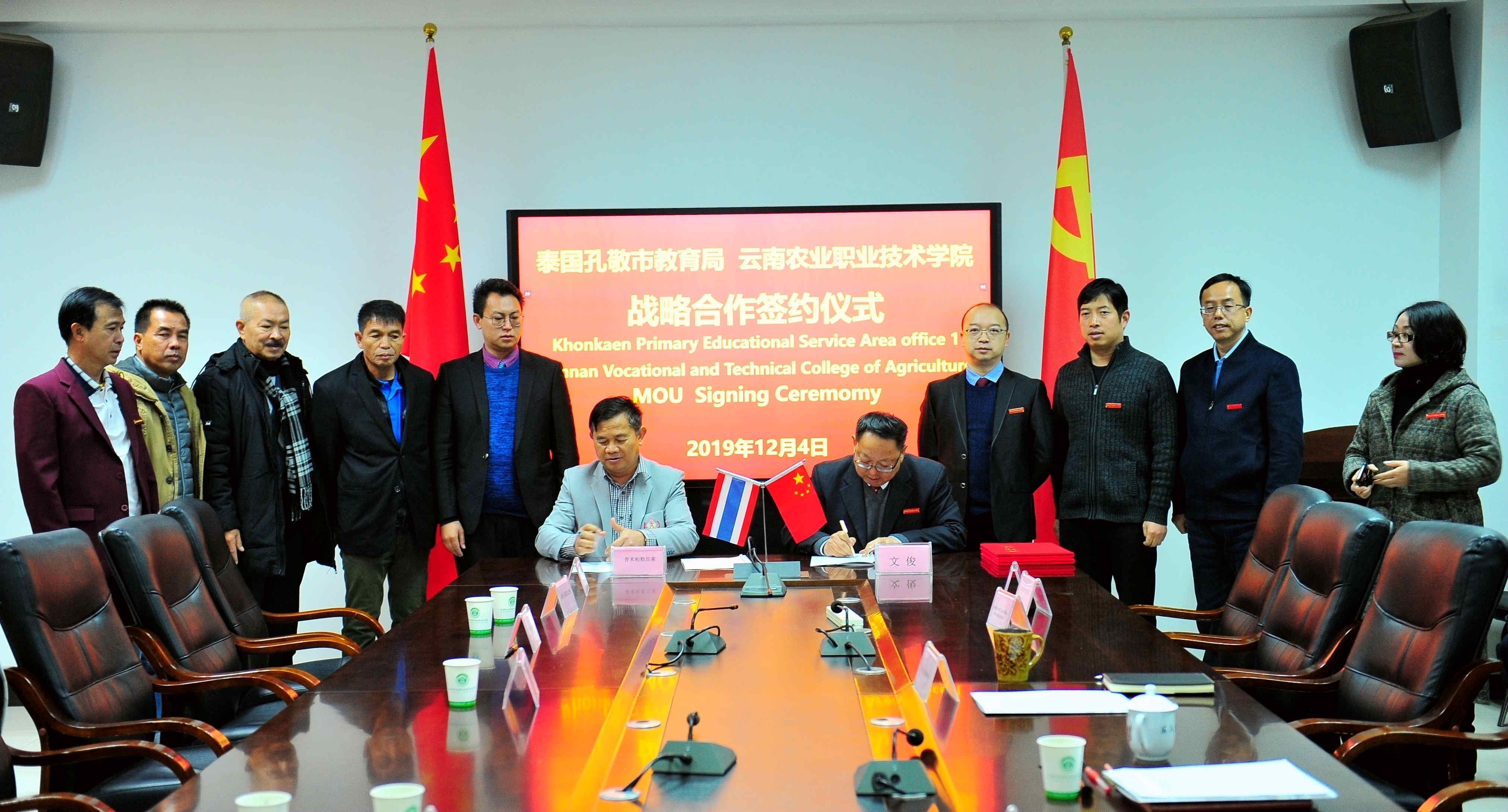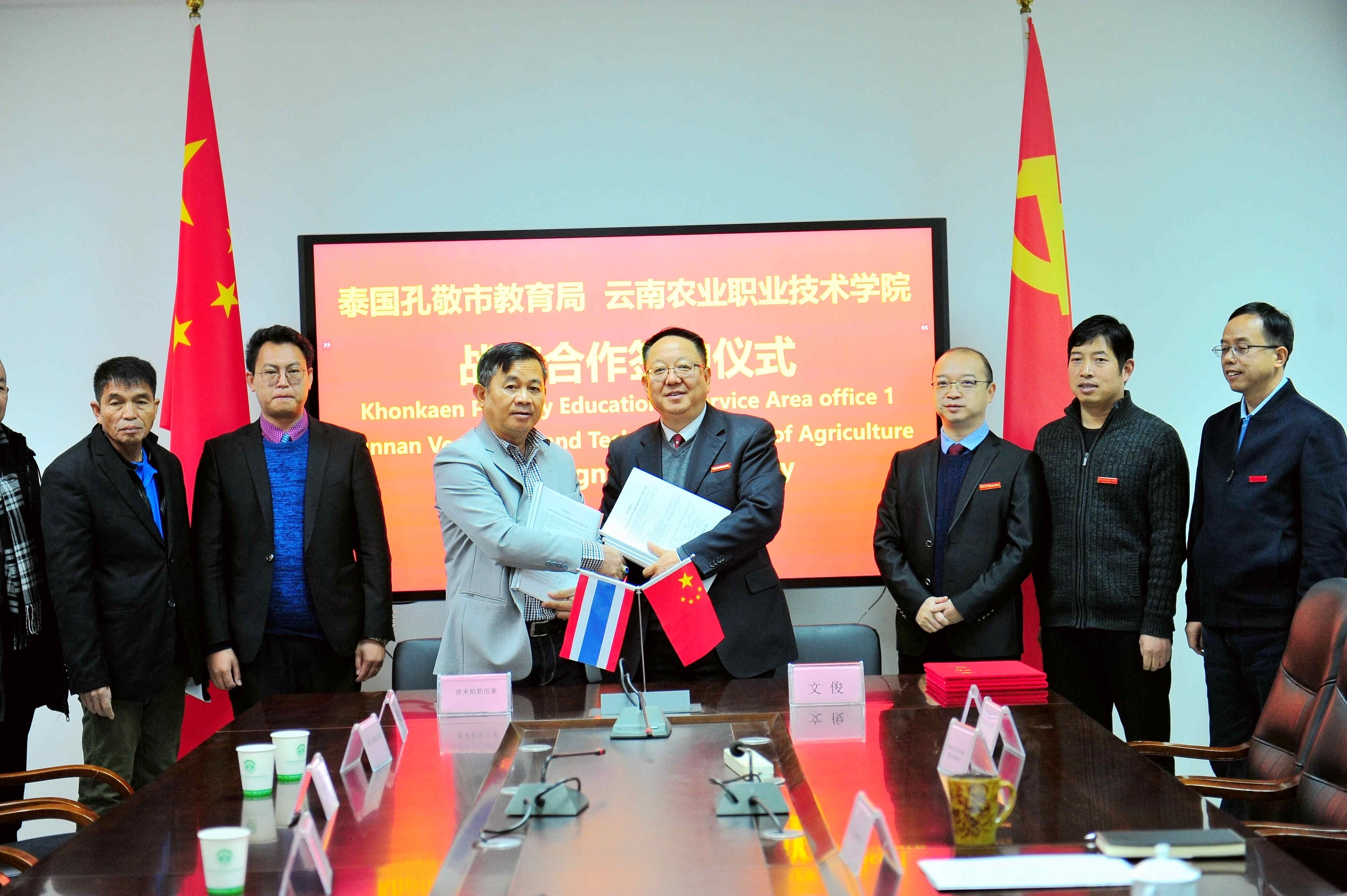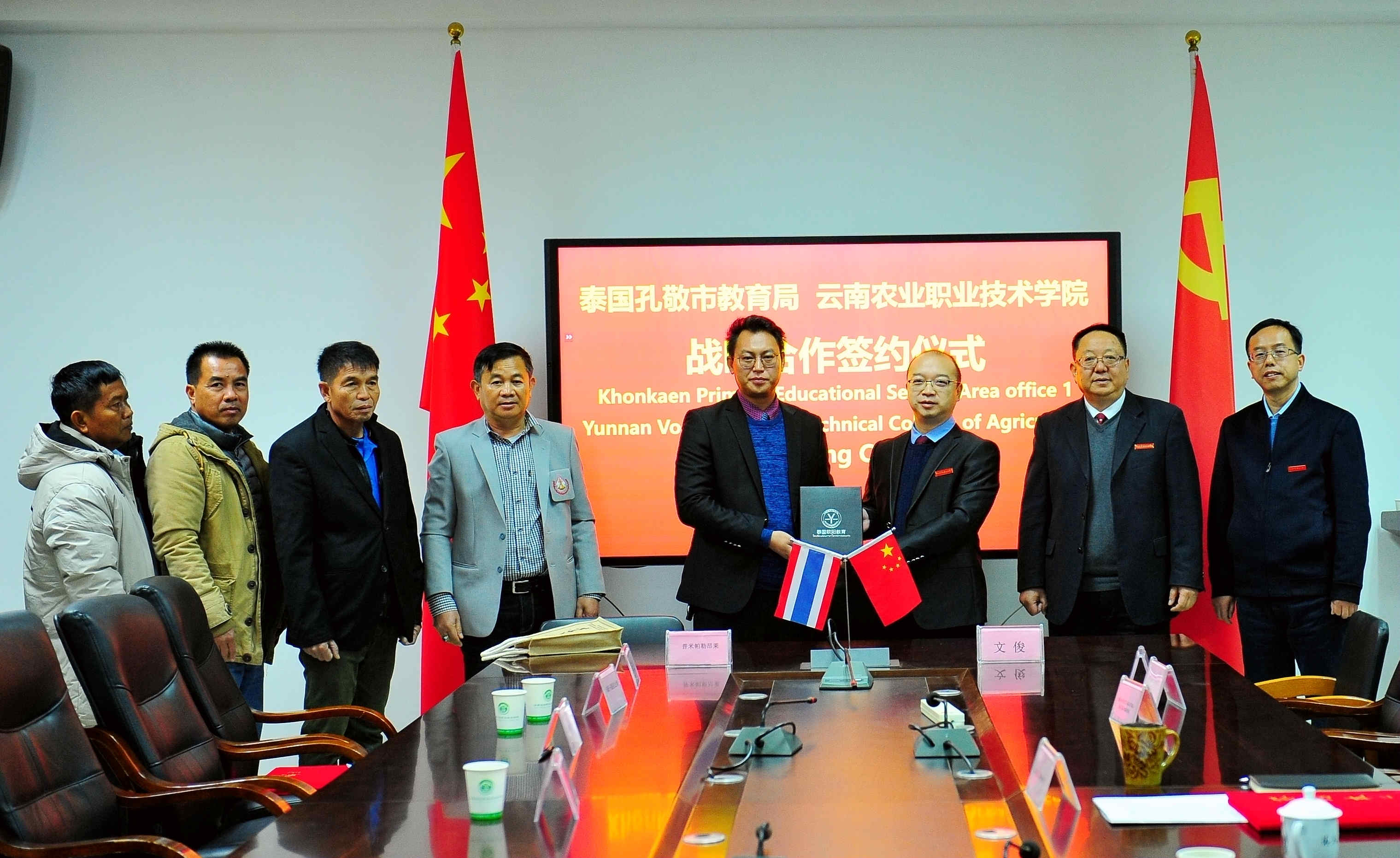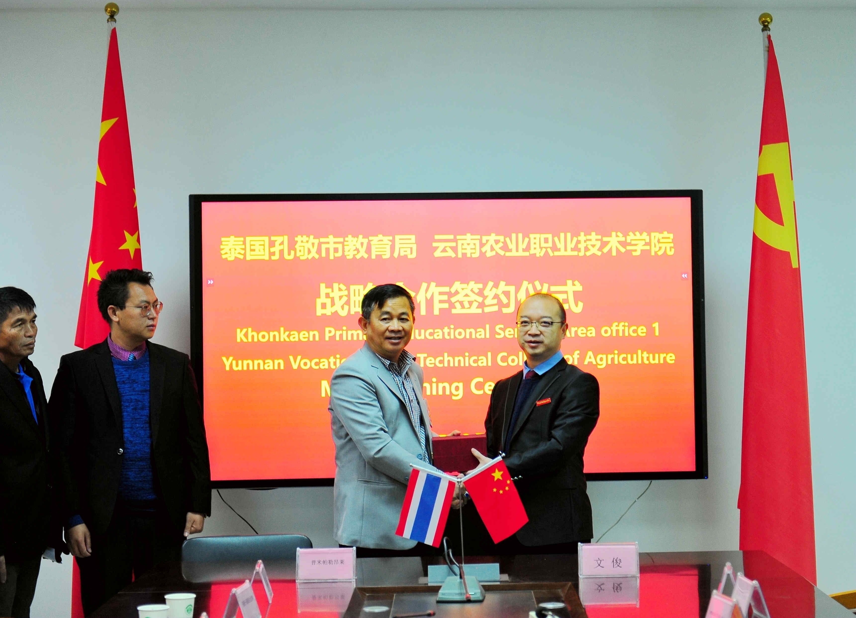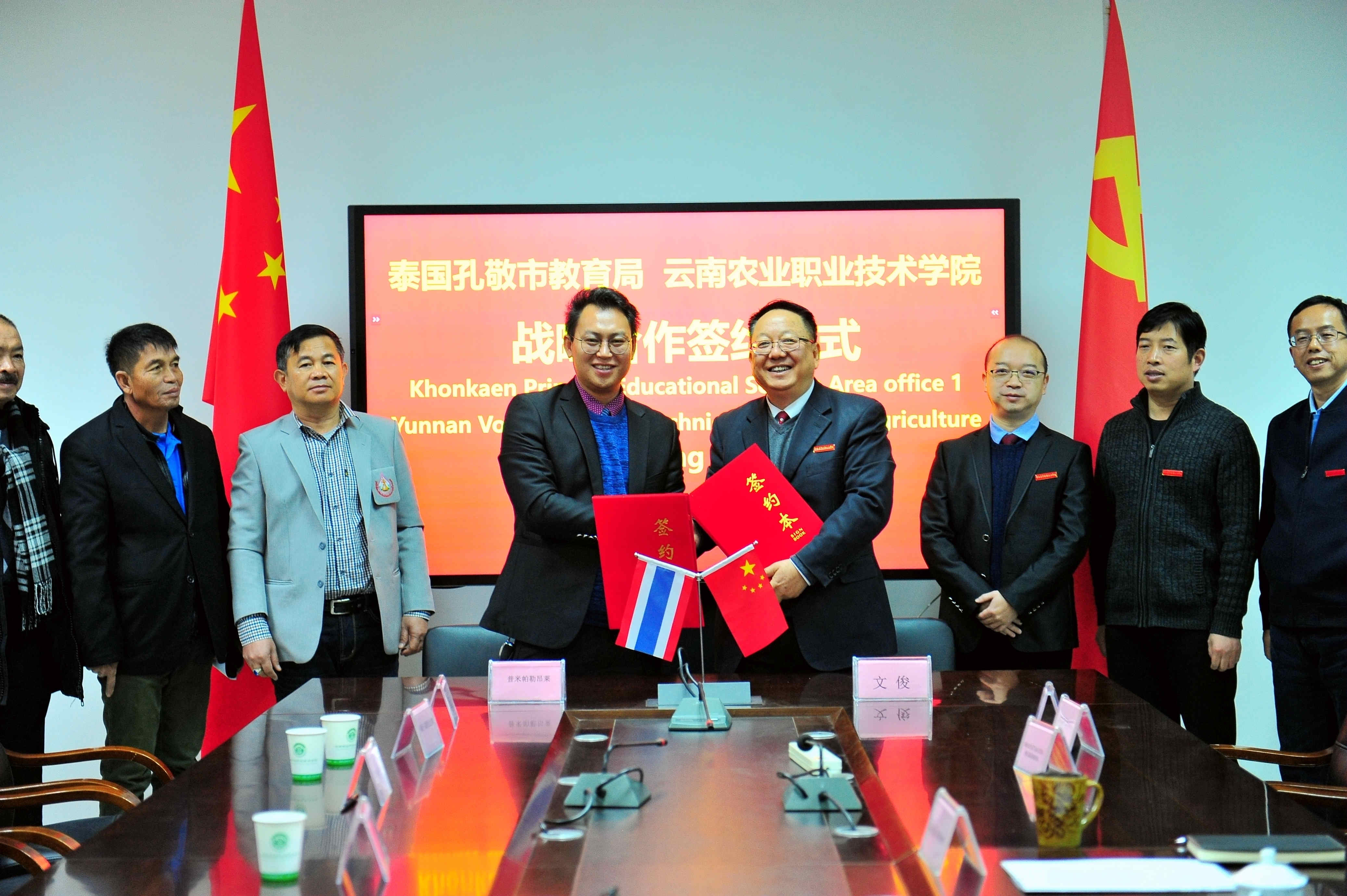 在本次座谈会上,学校与泰国孔敬教育局及下属相关学校签订了合作意向书,为双方增进联系,加强在语言教学、教育研究等领域的合作交流奠定了坚实基础。同时,双方交换纪念品,合影留念,互致谢意。(党委宣传部)