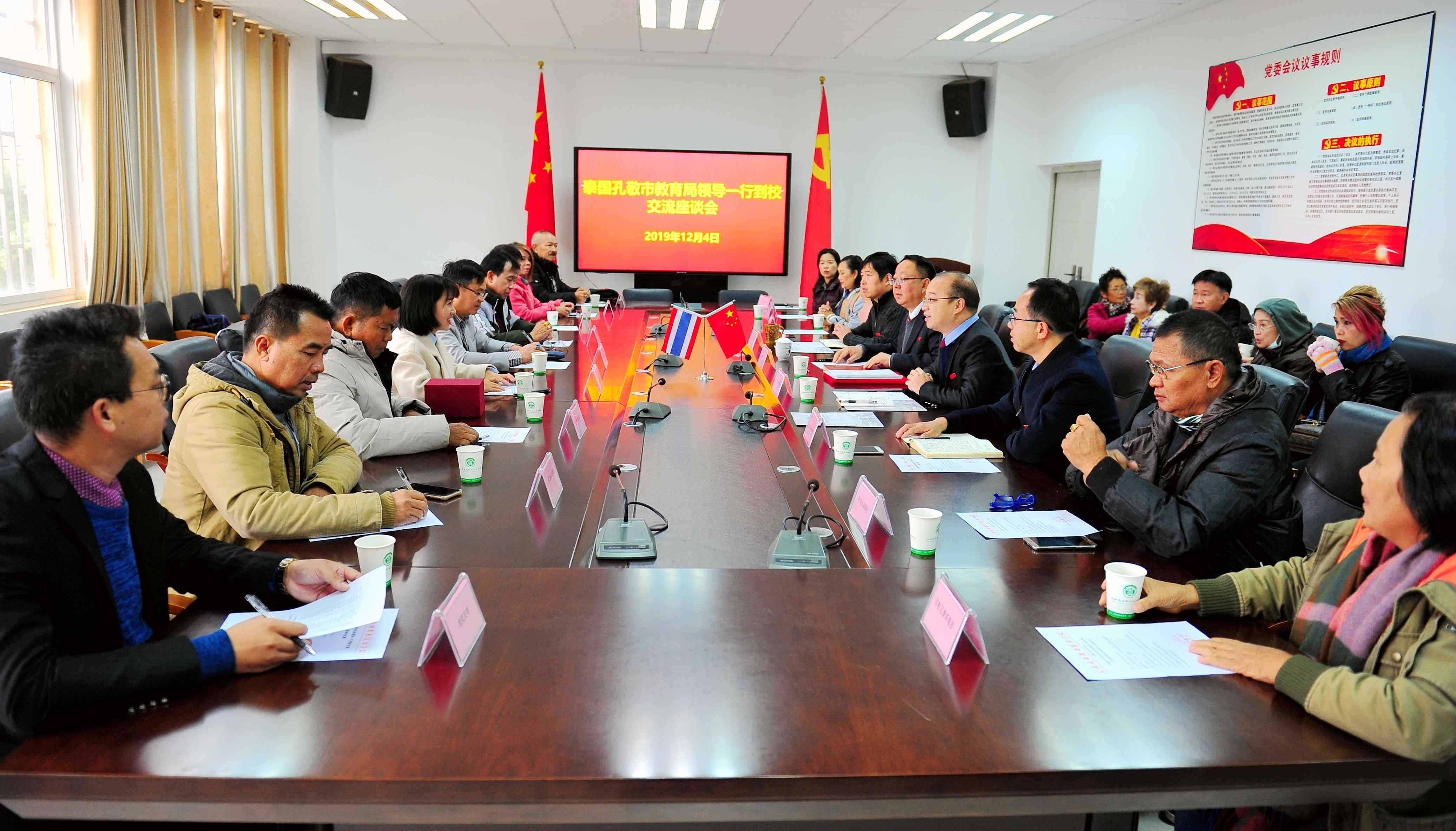 通知中心12月4日上午,泰国孔敬市教育局领导一行到我校访问交流。我校在小哨校区综合楼四楼会议室举行了座谈会,院长文俊、副院长杨波出席座谈会,党院办、宣传部、教务处负责人及对外交流处全体人员 参加了交流座谈。座谈会由副院长杨波主持。