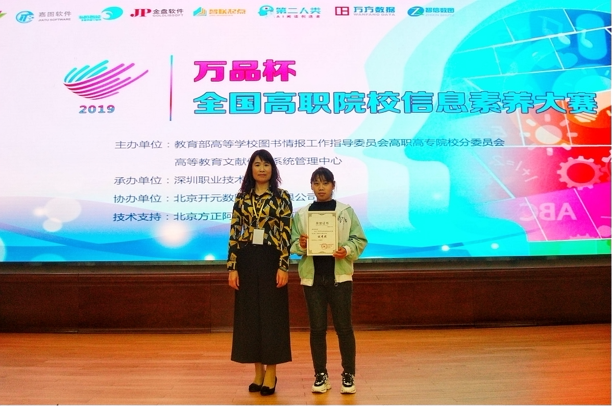 学校主管领导高度支持此次比赛,积极安排图书馆老师指导单正梓同学参加该项赛事,通过组织我校学生参赛,促进了学生对信息意识、信息技能和信息共享等信息素养技能的学习,实现通过“以赛促学、以赛促教、以赛促建”,全面助力提升高职院校师生的整体信息素养水平,加强了图书馆资源和服务的宣传推广,图书馆指导老师的信息素养教学水平也有很大提升,获得全省最佳教学奖。(图书馆供稿)