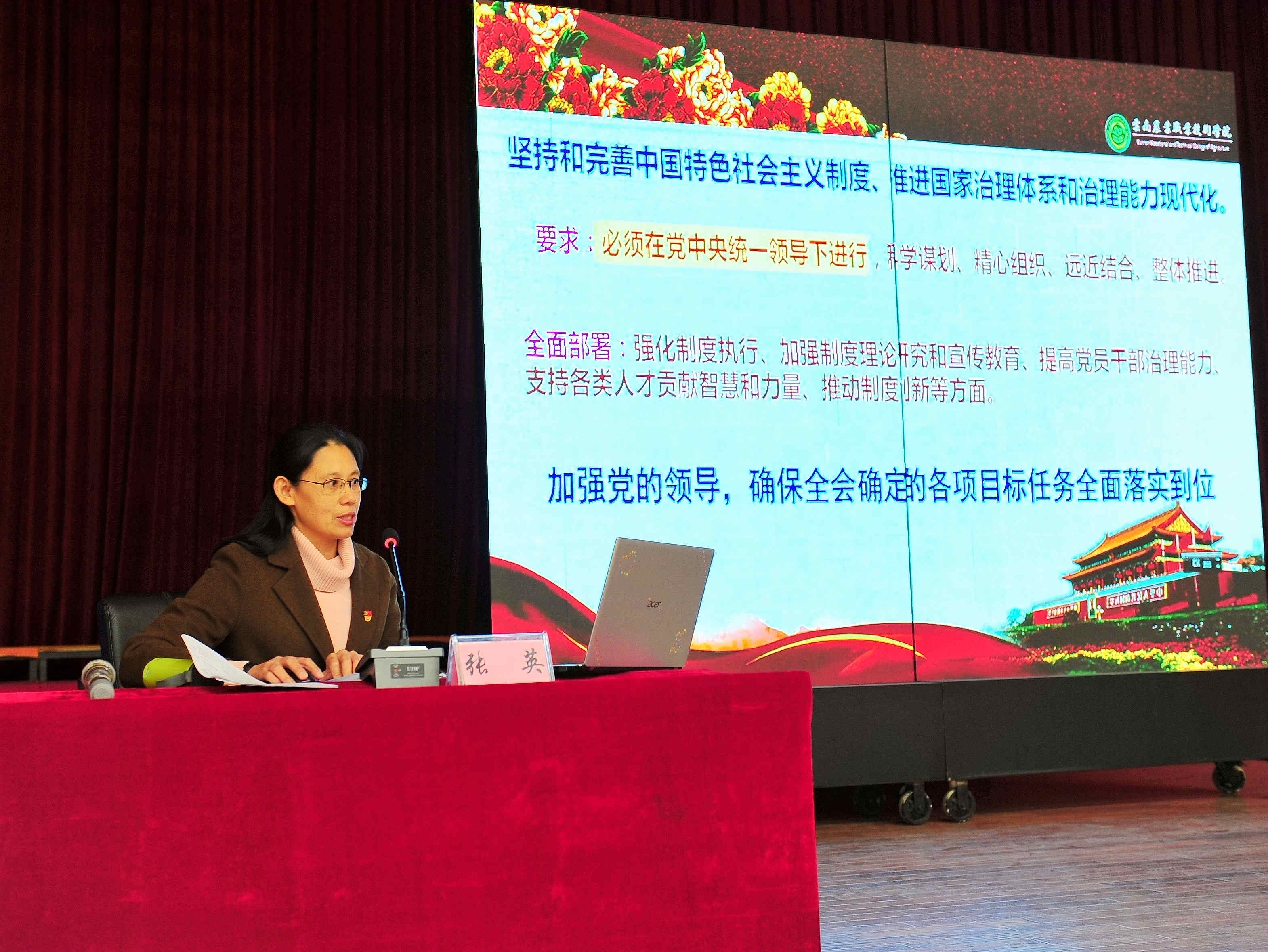 思想政治理论课教学科研部主任张英从加强党的领导,确保全会确定的各项目标任务全面落实到位方面进行了重点强调。她指出,一是要毫不动摇的坚持和巩固中国特色社会主义制度,二是要与时俱进完善发展中国特色社会主义制度和国家治理体系,三是要严格遵守和执行中国特色社会主义制度。