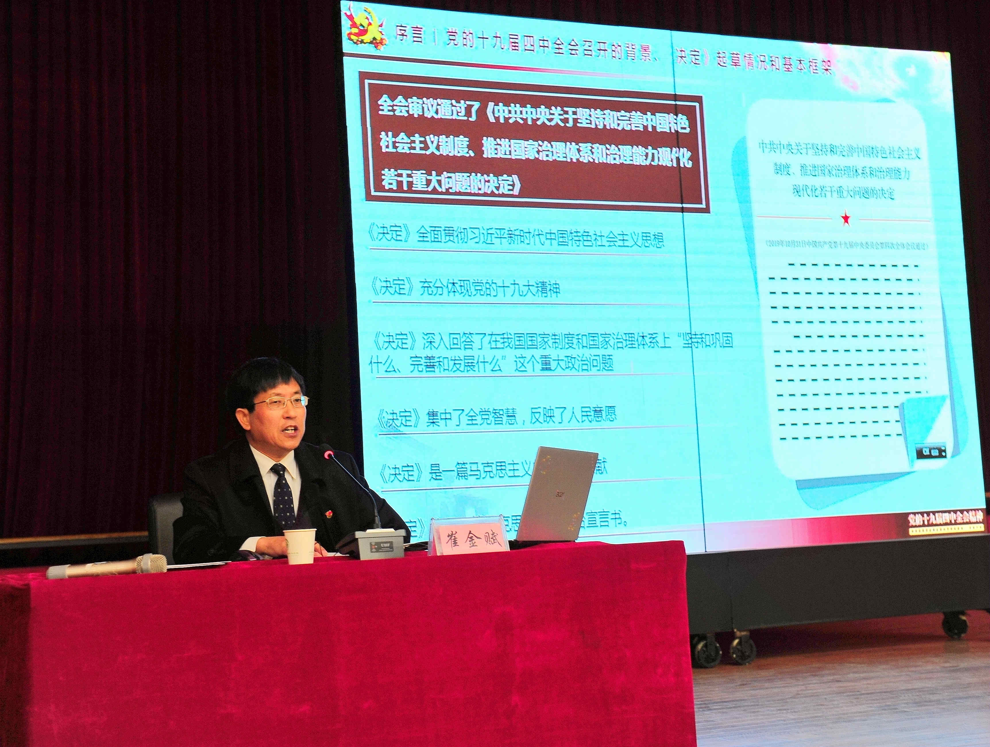 在宣讲中,党委书记崔金赋从党的十九届四中全会召开的背景、《决定》起草情况和基本框架、充分认识坚持和完善中国特色社会主义制度、推进国家治理体系和治理能力现代化的重大意义;深刻领会中国特色社会主义制度和国家治理体系的显著优势,坚定中国特色社会主义制度自信等方面对党的十九届四中全会精神作了详细解读。他要求全校教职工要全面深入学习,充分认识和准确把握党的十九届四中全会的重大意义和主要精神。党员领导干部带头学、基层党组织跟进学、专题培训系统学、联系实际深入学,实现全校干部师生的全覆盖,把握全会精神的核心要义,把思想和行动统一到全会精神上来。