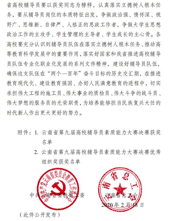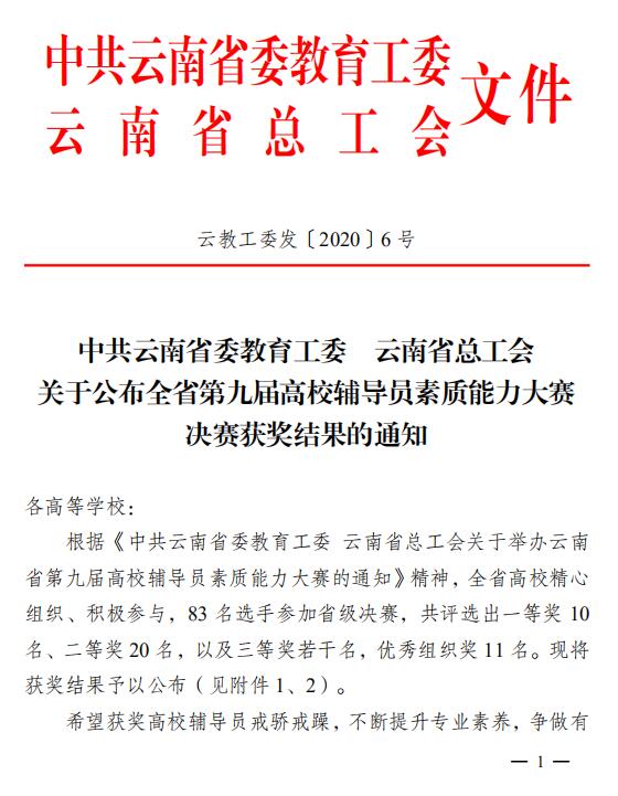 通知中心2月18日,省委教育工委和省总工会联合发文公布全省第九届高校辅导员素质能力大赛决赛获奖结果,我院徐率老师从83名竞争对手中脱颖而出,荣获本次大赛三等奖。