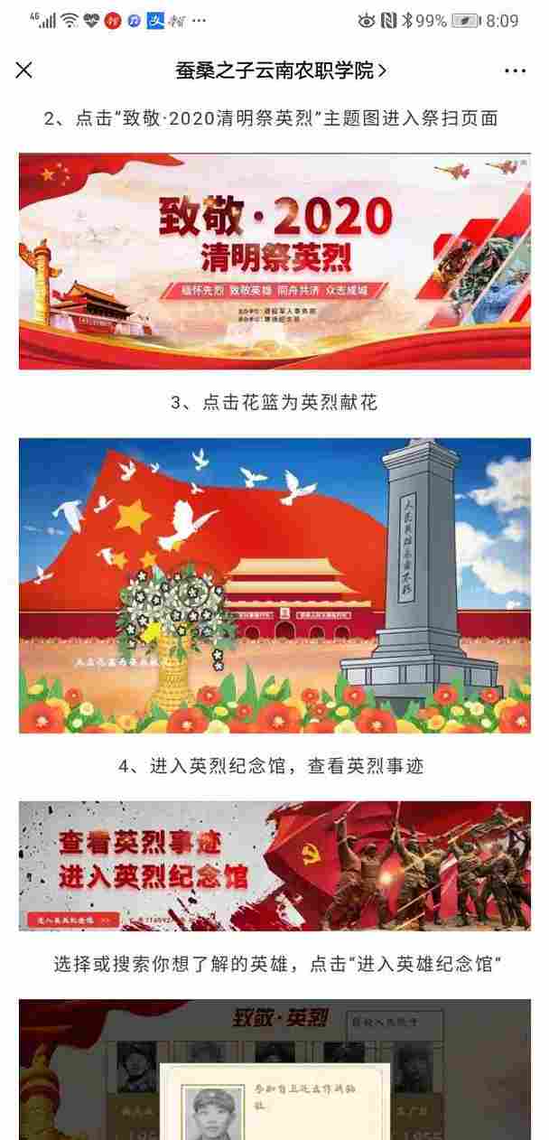 师生们通过中华英烈网和江南网页版登录入口官网网址查询 蚕桑之子公众号开设的“致敬·2020清明祭英烈”专栏,利用电脑、手机进行网上祭奠,向先烈献花、祭拜,了解英烈事迹,寄托对先烈们的哀思,抒写感言寄语,表达对革命先烈的怀念和崇敬之情。