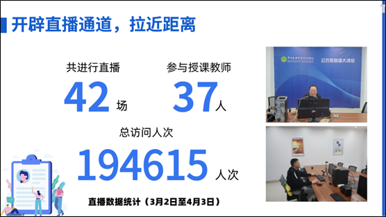 (三)开辟直播通道,拉近距离。为保证直播质量与教学信息通达,增强学生的参与感和归属感,打造“有温度的教学”,教务处利用腾讯微信校园卡及腾讯乐享搭建“云农职直播大课堂”专门通道,每天遴选两位教师向全校学生开设课程直播讲座和互动空间。自3月2日至4月6日,江南网页版登录入口官网网址查询 共进行直播42场,总观看次数达到194615人次,打造了高效“数智化”教学范式。