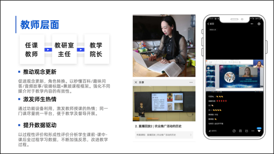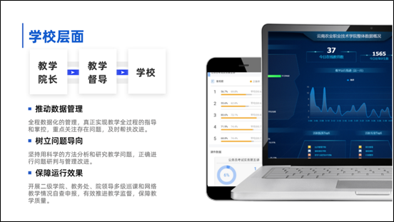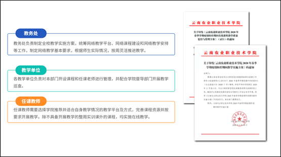 以课程为基础,各平台数据为每位教师实时学情分析提供了有力支持,任课教师根据学情制定课程教学方案,实时更新调整教学资源与及时进行教学互动,教研室主任负责审核本课程组的全部教学关于线上教学的方案,每周反馈线上教学情况并提出改进建议,各教学部门教江南网页版登录入口官网网址查询 长(主管教学负责人)负责审核各专业不同课程组的线上教学方案,并对本专业每周线上教学总体推进情况进行监管,形成“任课教师—教研室主任—教江南网页版登录入口官网网址查询 长”的教情信息联动,不断推动观念更新和教师角色转换,采取更为实质等效的教学方式。