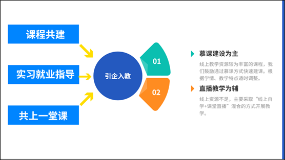 融合、开放、多元的线上教学形态,要求专业课程要打破传统章节式的课程体系,以多种形式将课堂教学与真实工作场景相融合。为此,学校积极搭建“灵活互融”的柔性课程体系,打造线上的“职业教育——产业介入”生态系统,进一步帮助学生了解职业、产业动态。针对此次疫情,在推进线上教学的过程中,部分课程还根据不同课程模块需要,校企共建课程标准和模块内容,利用云平台“主讲”、“辅讲”功能,校、企教师互为助教“共上一堂课”,共同推进线上教学的课程建设。