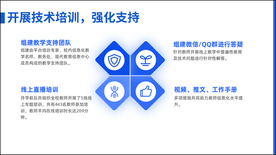 (四)开展技术培训,强化支持。学校下发培训通知,组建在线教学支持团队,组织专家直播授课等方式为教师们开展网络教学提供有力支撑。针对常用教学平台,组建微信/QQ群,安排专门技术人员随时进行平台使用方法的线上答疑和指导。同时,为满足教师网络教学需求,教务处整合网络资源,制定了教师线上自主提升实施方案。针对教师开展线上教学普遍面临的平台使用和技术问题,在开学前后组织全体教师开展了5场线上专题培训,共有443名教师参加培训,教师平均在线培训时长达209分钟,同时辅以教程、视频、推文、工作手册等方式及时为教师答疑解惑。进一步提升教师信息化水平。