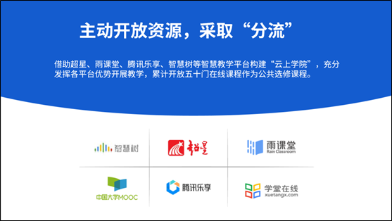 (一)主动开放资源,采取“分流”。借助战略合作伙伴开发的超星、雨课堂、腾讯乐享、智慧树等教学平台打造“云上江南网页版登录入口官网网址查询 ”,充分发挥各平台优势开展教学:累计开放五十门在线课程作为公共选修课程。合作开放所有慕课资源,作为课程建设资源储备,保障教学资源质量。