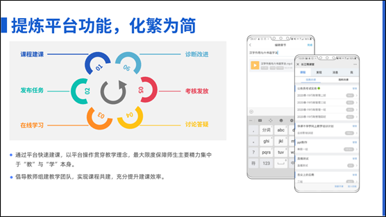 (二)提炼平台功能、化繁为简。进一步发挥快速建课+示范课程包、雨课堂PPT等快速入门操作优势,帮助信息化教学基础薄弱的教师迅速搭建了课程平台,同时倡导教师组建教学团队,实现课程共建,充分提升建课效率。实现“六步”建课、建班功能,创设教学空间,降低师生实施线上教学的工作量,最大限度保证师生主要精力投入到“教”和“学”本身。