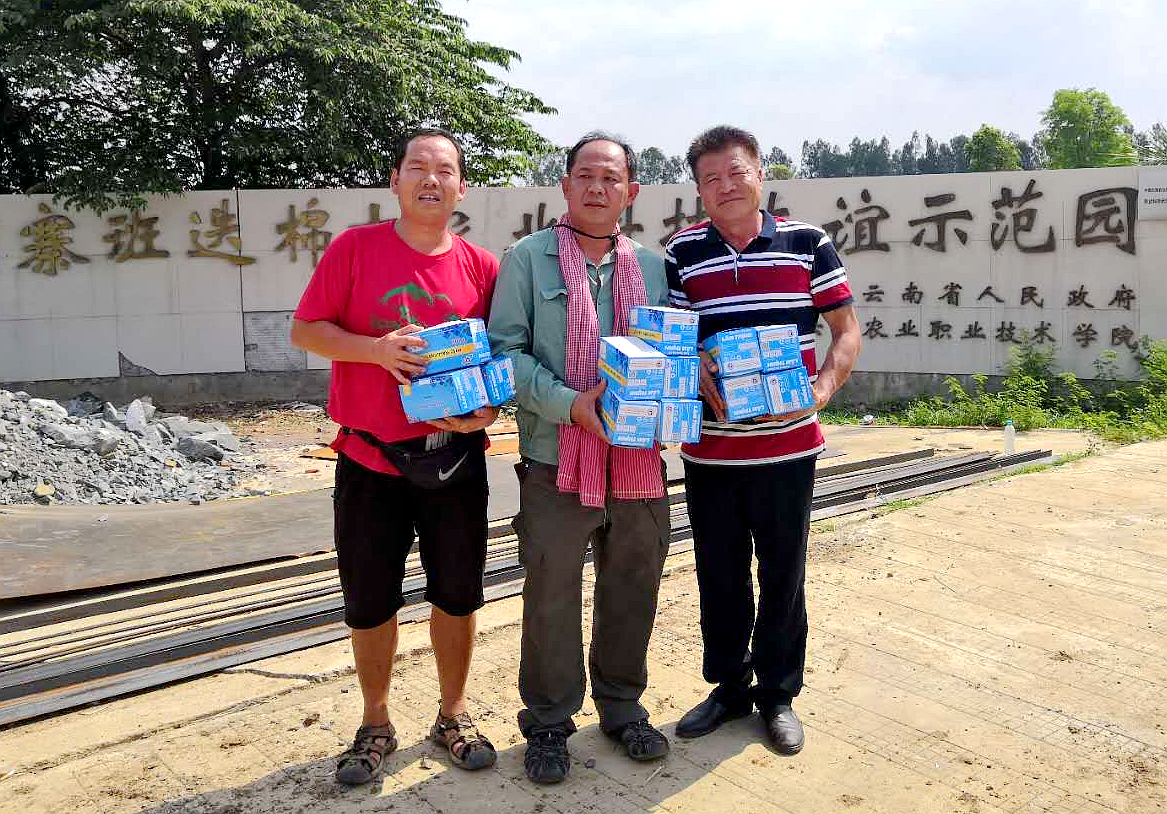 二、加大宣传力度,增进中柬友情。一是工作组副组长兼柬埔寨语翻译杨卫国老师发挥语言优势,向周边村民和社会交往人员宣传中国防疫措施及防疫知识,消除他们误认为柬埔寨气温高不会感染新冠肺炎病毒的思想言论,让当地民众意识到防疫的重要性,提升自我防护意识。二是当地销售商对我国的防疫工作进行了感谢并坚信中国定会帮助柬埔寨做好防疫工作,表示要将中国好的防疫做法宣传进村。三是3月21日,柬埔寨班迭棉吉省省长到示范园视察和看望工作组成员,并送来珍贵的防疫口罩。工作组成员留下必需的口罩后,还分出150个口罩给园区周边3家农户20人,进一步宣传防疫知识,工作组的责任心及关爱情体现了两国人民守望相助、情同手足的兄弟情谊。