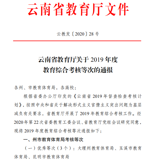 通知中心近日,我院在云南省教育厅2019年度教育综合考评中荣获“优秀”等次,是全省48所高职(专科)院校中获评“优秀”的9所高校之一。