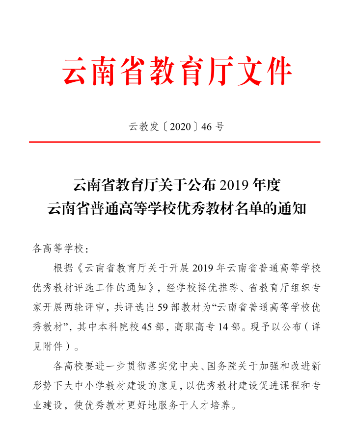 据悉,此次评选根据《云南省教育厅关于开展2019年云南省普通高等学校优秀教材评选工作的通知》要求,经学校择优推荐,省教育厅组织专家开展了两轮评审,全省高等学校共申报216本,第一轮评估确认100本,第二轮确定59本为“云南省普通高等学校优秀教材”,其中高职高专15本。