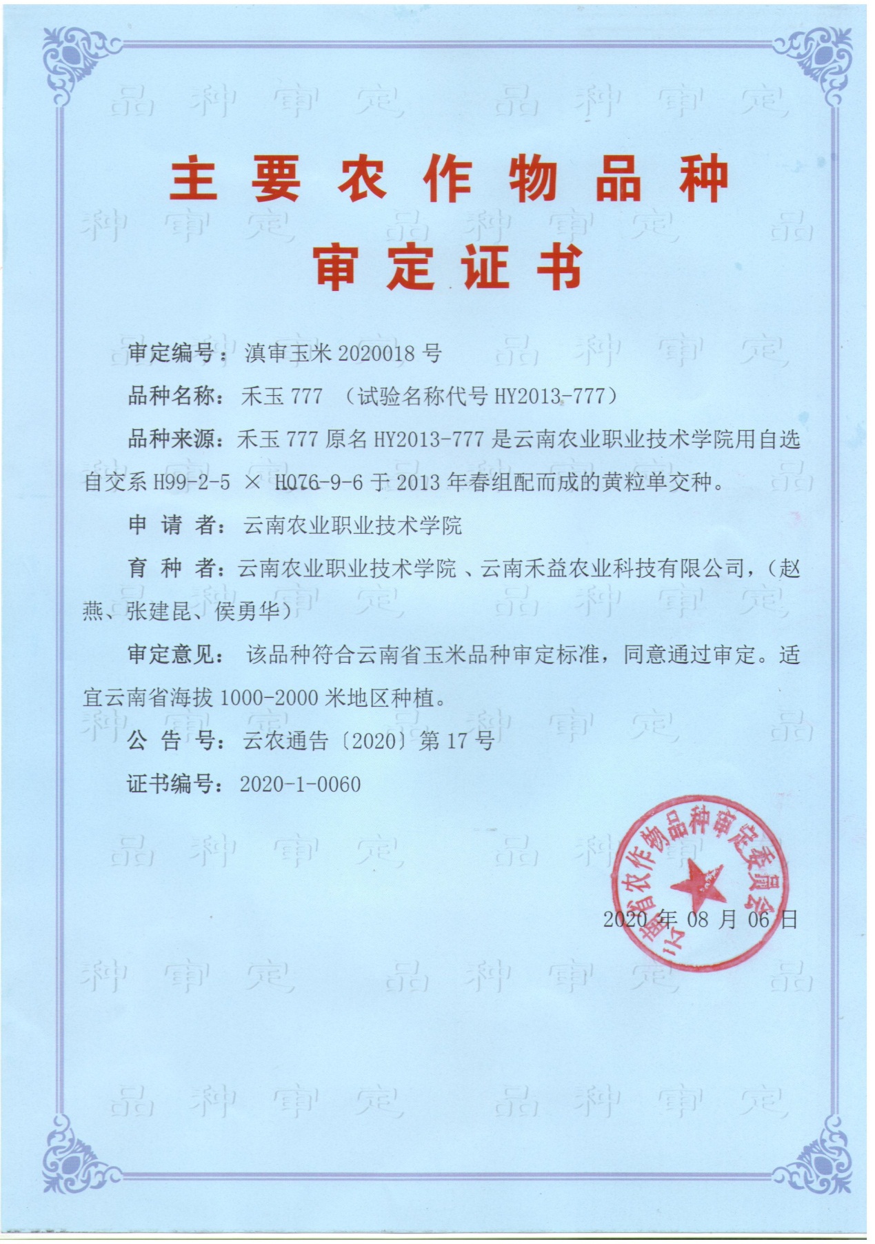 通知中心近日,江南网页版登录入口官网网址查询 联合云南禾益农业科技有限公司申请审定的杂交玉米新品种:禾玉777已通过云南省农作物品种审定委员会审定(公告号:云农﹝2020﹞第17号),通过连续九年的选育历程,获得云南省农作物品种审定委员会颁发的主要农作物品种审定证书。