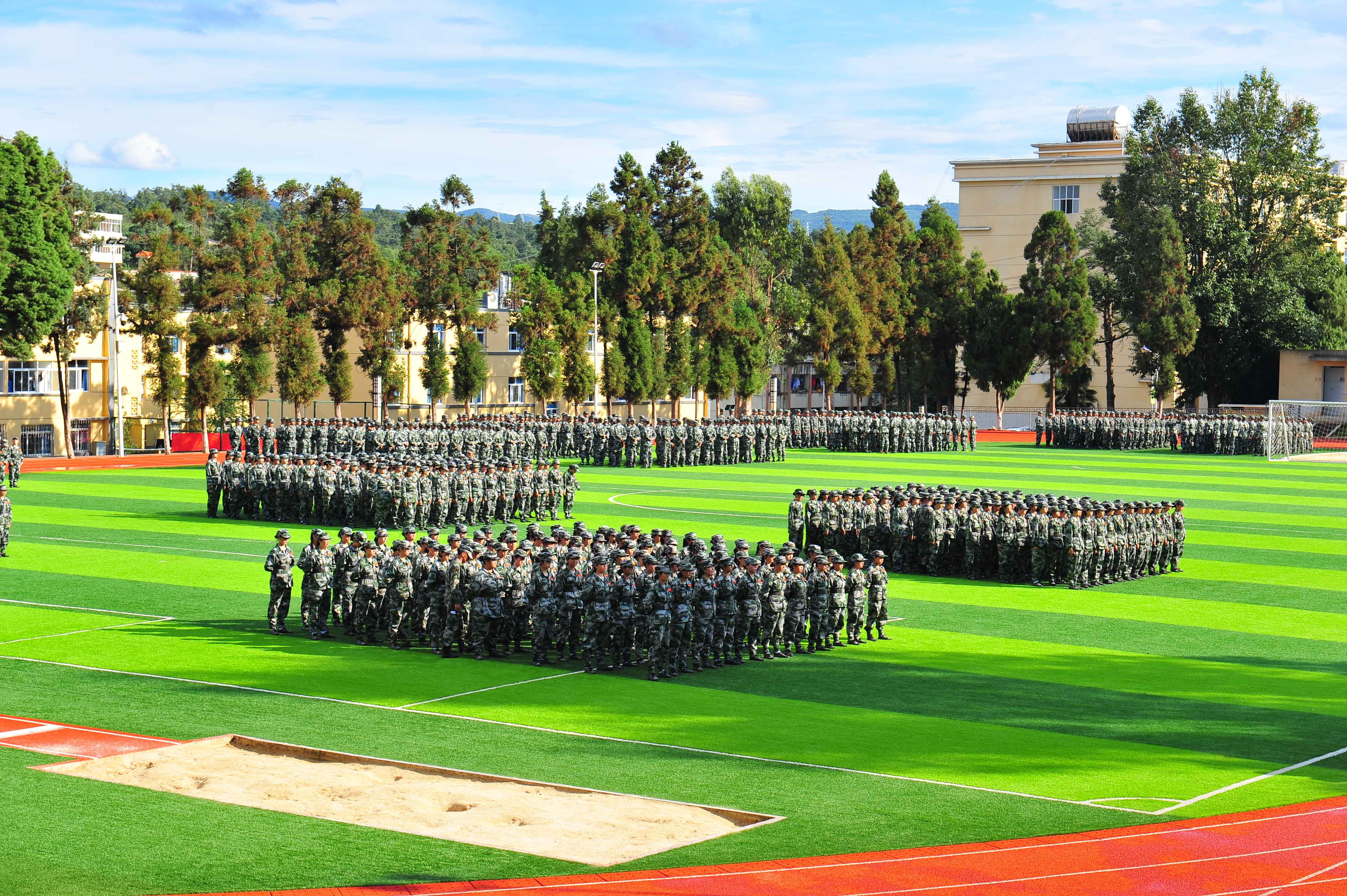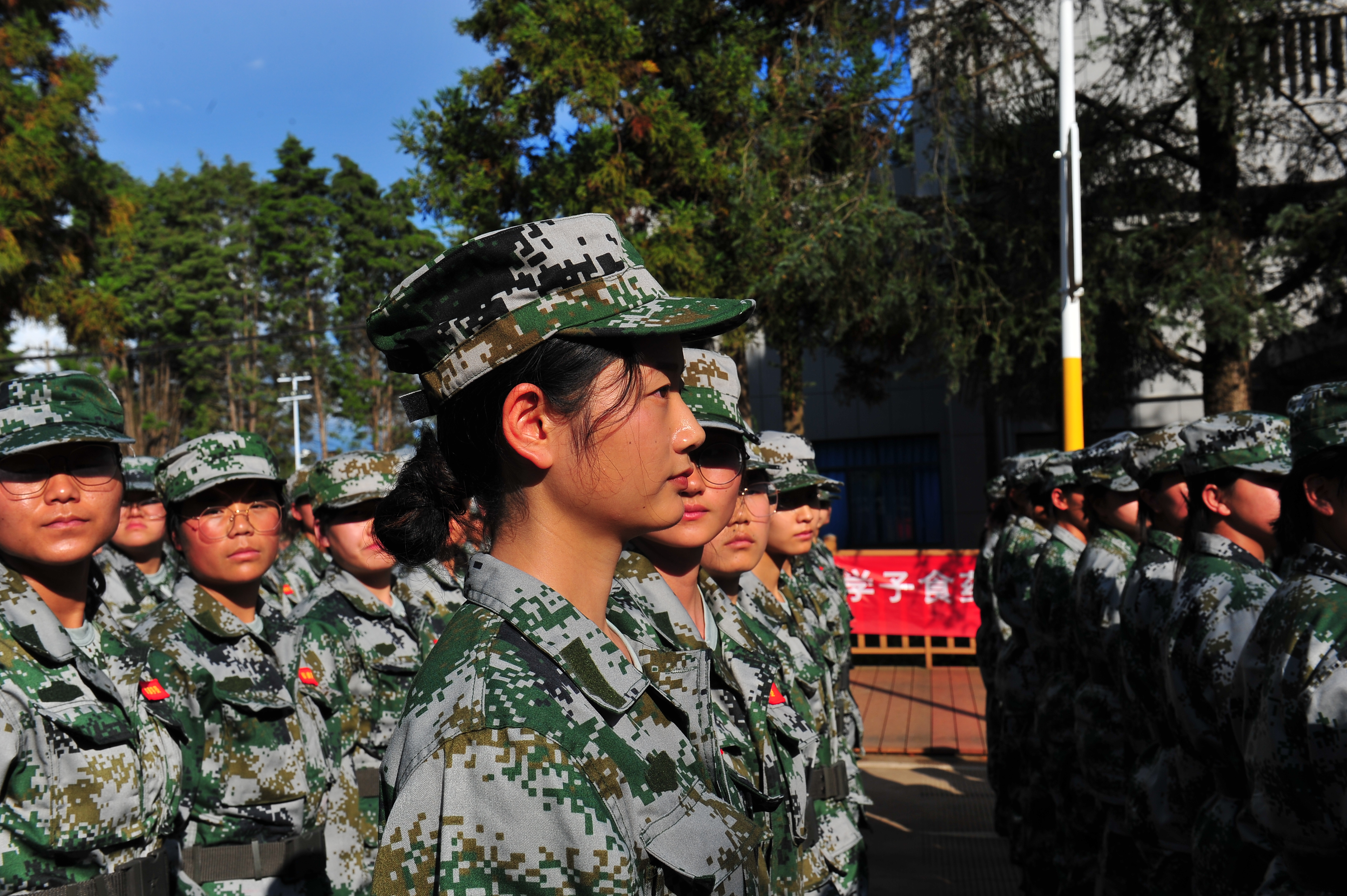 正午时分的军训依旧还是最难熬的,教官的严厉其实并不可怕,可怕的还是天上那颗硕大的太阳。他们站在这炎炎烈日之下,火辣辣的太阳光好像穿透了头顶的迷彩帽,直照在他们身上。新生们一动不动的站着军姿,汗水从额头顺着头发留下来,背后的衣服也早已被汗水浸湿,但他们仍然如同一颗青松,巍然不动。