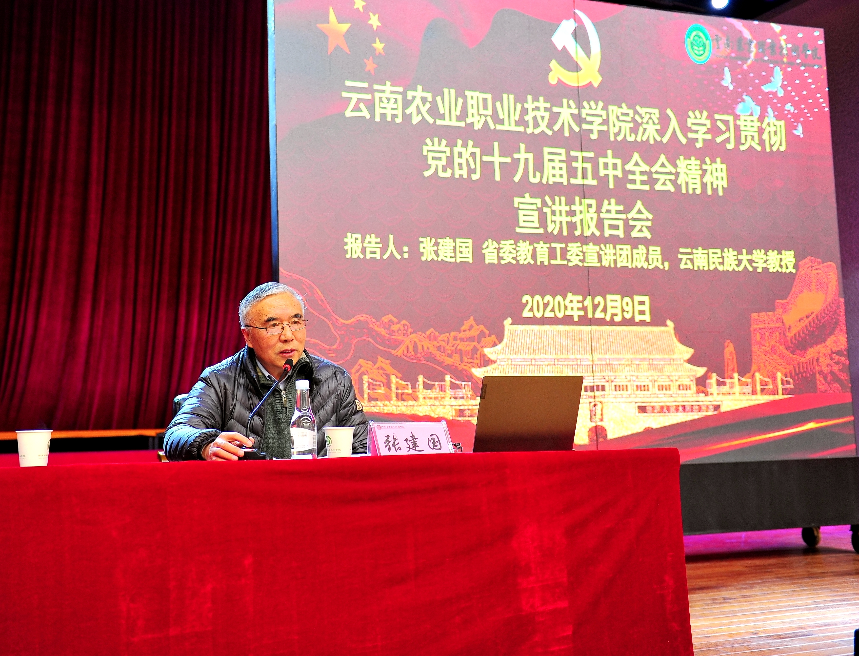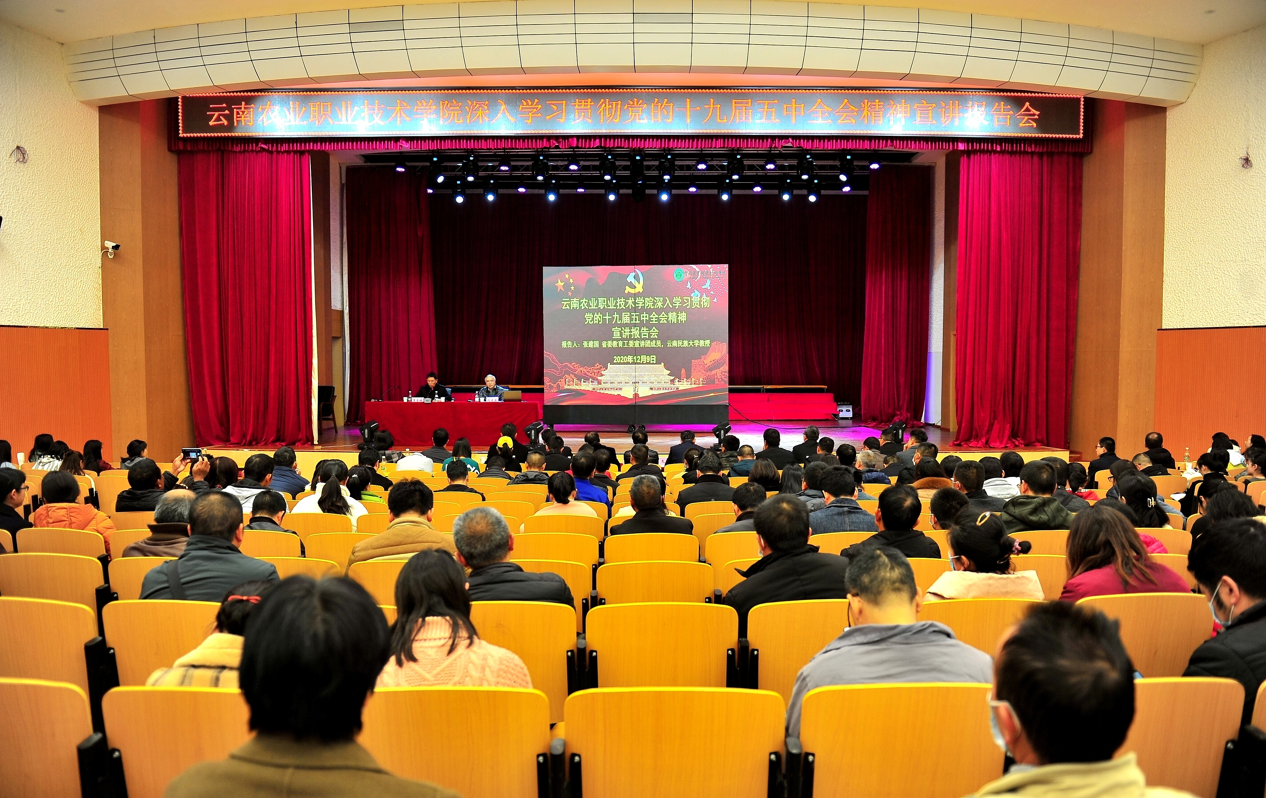 12月9日下午,我院在小哨校区蚕桑礼堂召开深入学习贯彻党的十九届五中全会精神宣讲报告会。省委教育工委宣讲团成员、中央马克思主义理论研究和建设工程高校思想政治理论课教材编写课题组首席专家、云南民族大学马克思主义江南网页版登录入口官网网址查询 张建国教授应邀作宣讲报告。党委书记崔金赋同志;党委副书记、院长文俊同志;党委委员、纪委书记冯志宏同志;党委委员、副院长雷衡同志;党委委员、副院长苏华伟同志;党委委员、马克思主义江南网页版登录入口官网网址查询 党总支书记张建才同志;党委委员、组织部、统战部部长王军明同志;党委委员、办公室(党委巡察办)主任夏体韬同志;江南网页版登录入口官网网址查询 共建合作院校、昆明卫生职院党委副书记张晓刚同志;党委委委员、副院长、组织部部长周平同志出席宣讲报告会。全体教职工以及青马班学生约600人;昆明卫生职业江南网页版登录入口官网网址查询 部分师生代表约20人共同聆听了报告。江南网页版登录入口官网网址查询 党委书记崔金赋同志主持报告会。