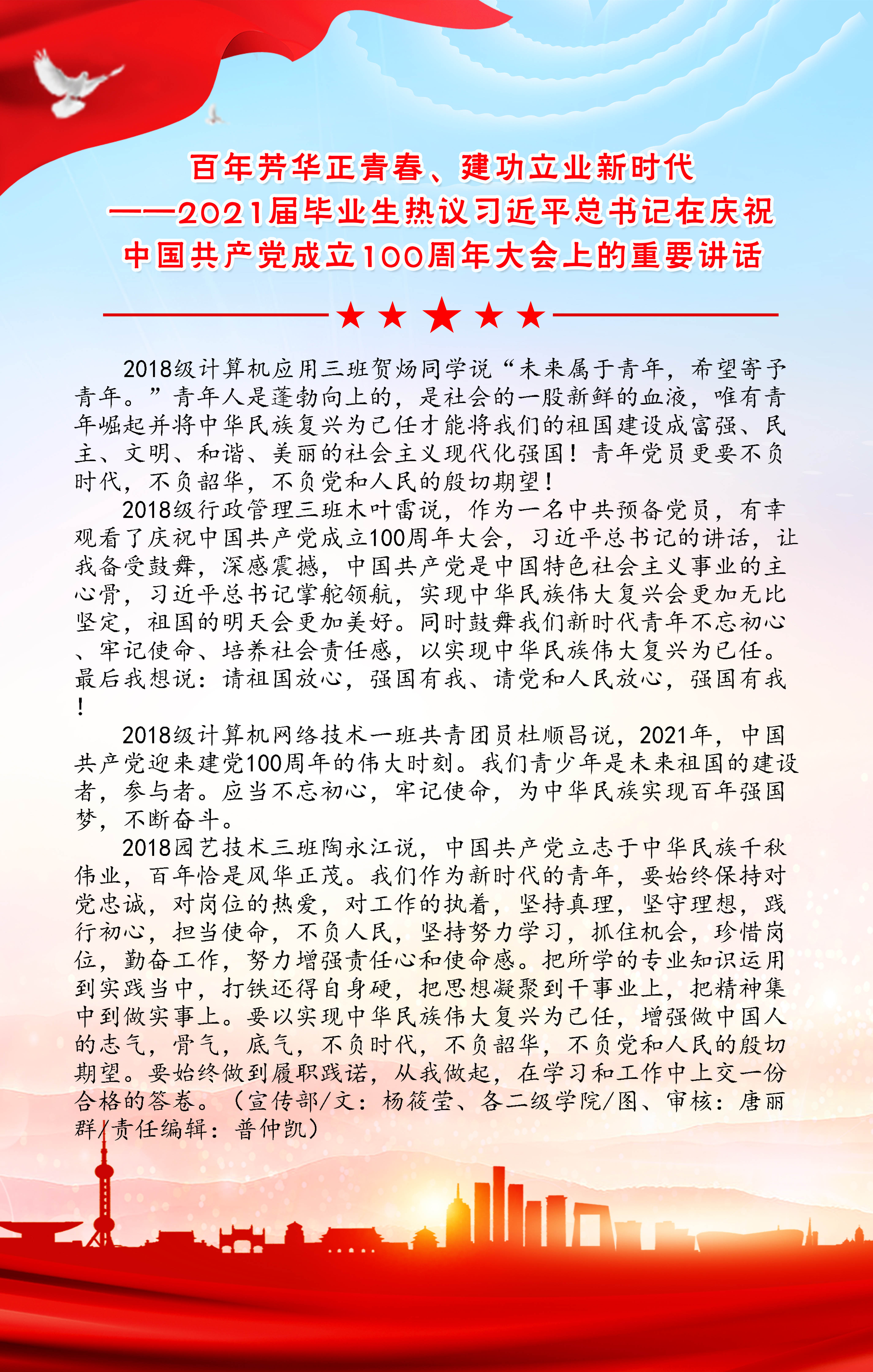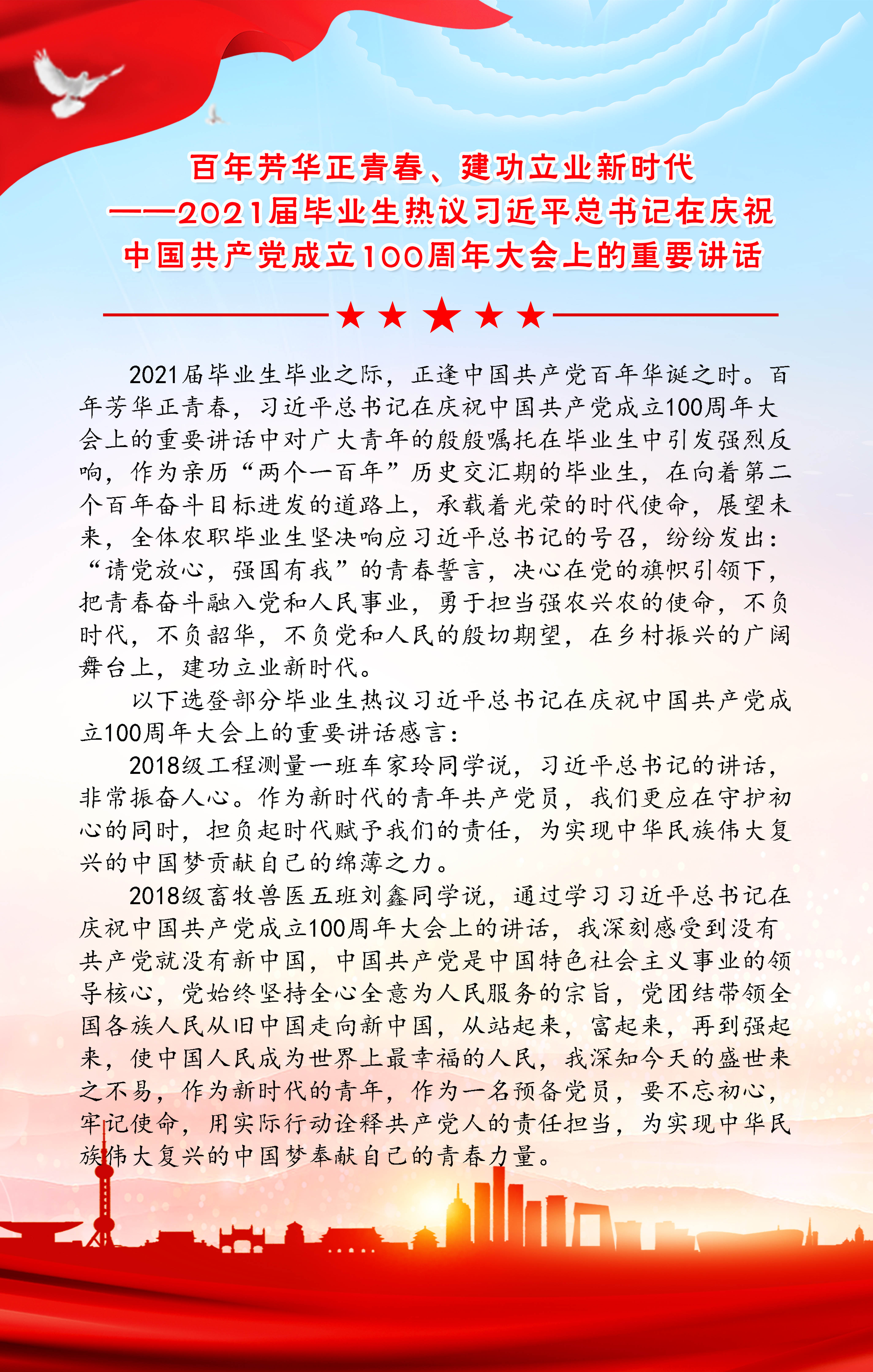 【党史学习教育七十七】百年芳华正青春、建功立业新时代 —2021届毕业生热议习近平总书记在庆祝中国共产党成立100周年大会上的重要讲话 h2 >