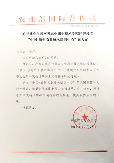 挂牌设立“中国-缅甸农业技术培训中心”的复函》。
